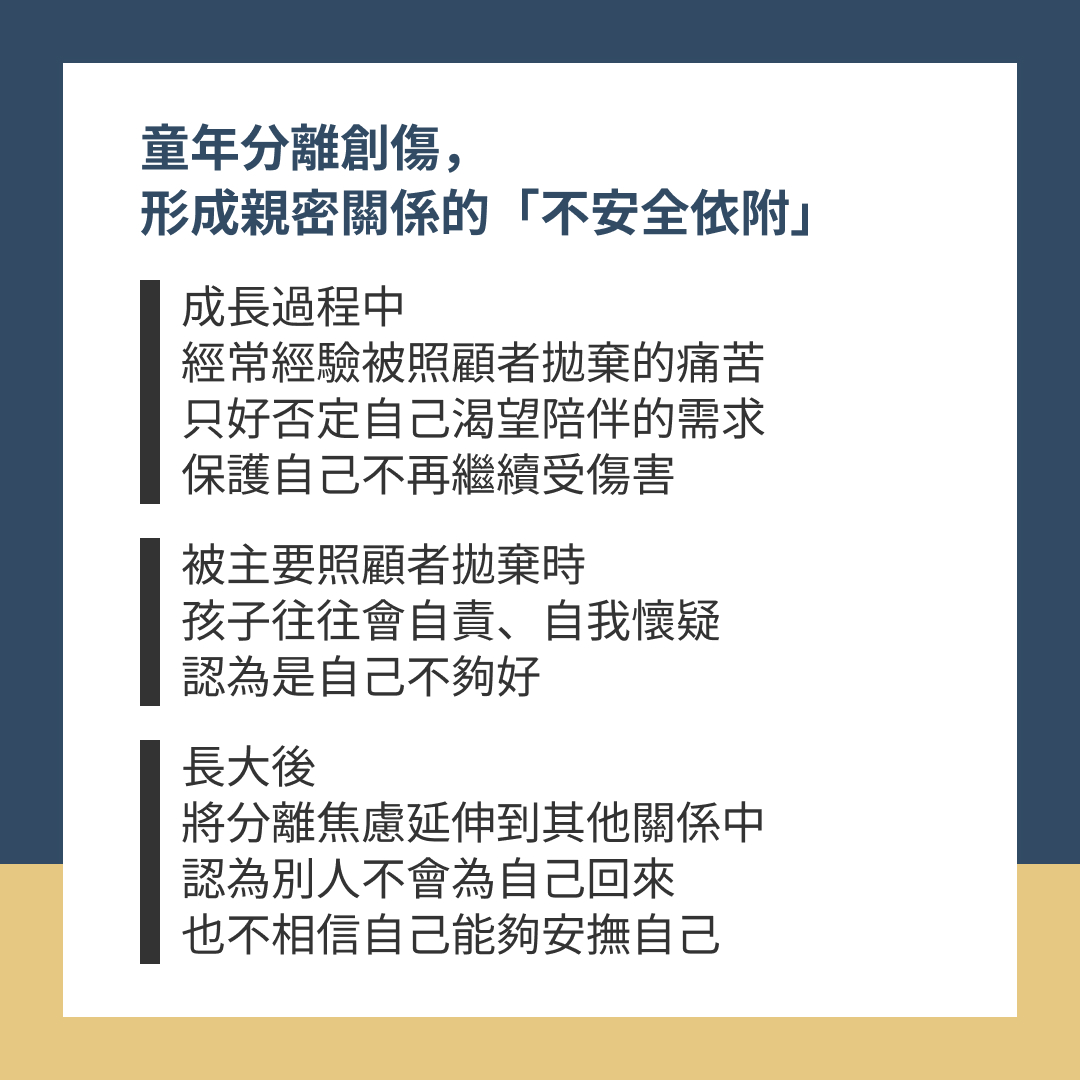 長大後,將分離焦慮延伸到其他關係中,認為別人不會為自己回來,也不相信自己能夠安撫自己