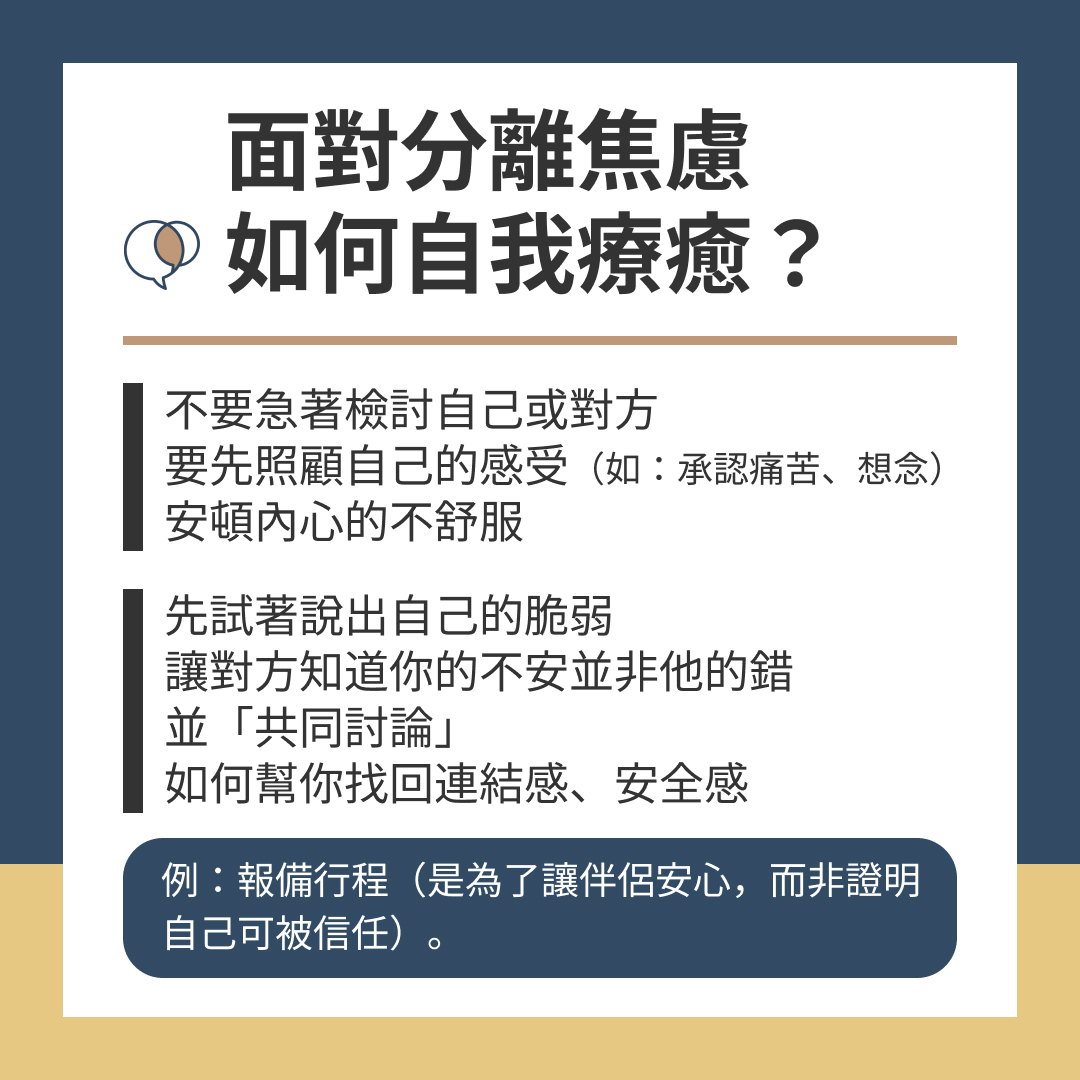 面對分離焦慮,不要急著檢討自己或對方,要先照顧自己的感受(如:承認自己的痛苦、想念),安頓內心的不舒服