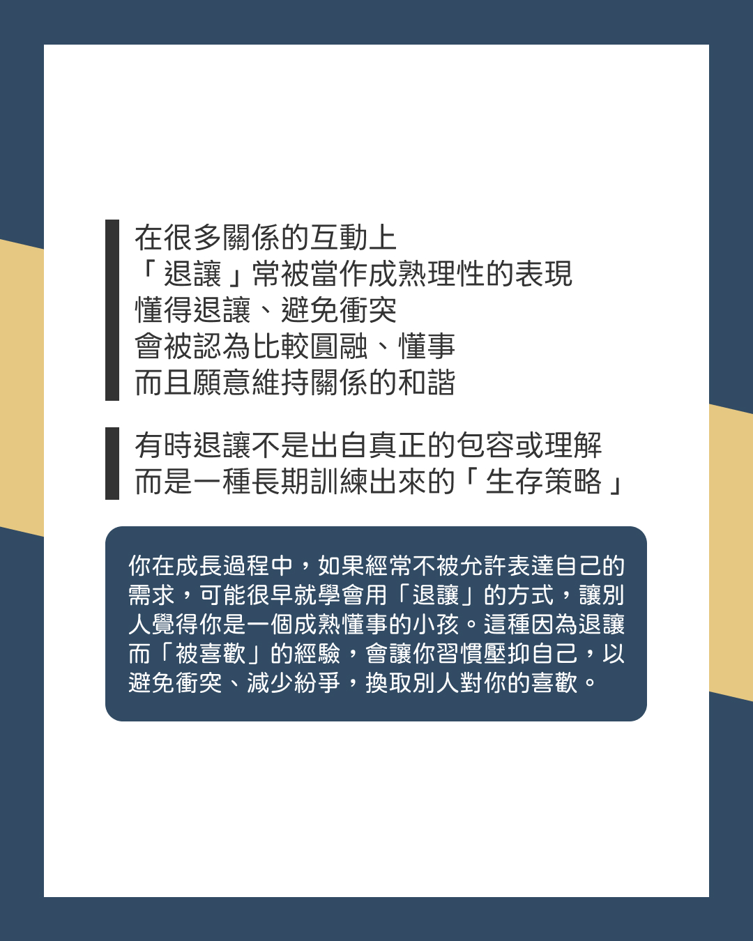 你的成長過程中,如果經常不被允許表達自己的需求,可能很早就學會用「退讓」的方式,讓別人覺得你是一個成熟懂事的小孩。這種因為退讓而「被喜歡」的經驗,會讓你習慣壓抑自己,以避免衝突、減少紛爭,換取別人對你的喜歡。