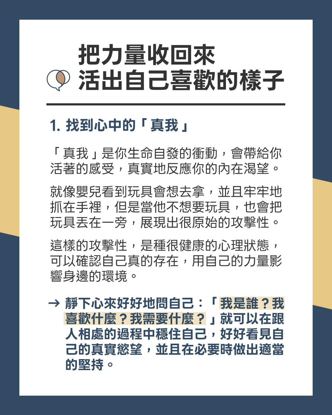 → 靜下心來好好地問自己:「我是誰?我喜歡什麼?我需要什麼?」就可以在跟人相處的過程中穩住自己,好好看見自己的真實慾望,並且在必要時做出適當的堅持。