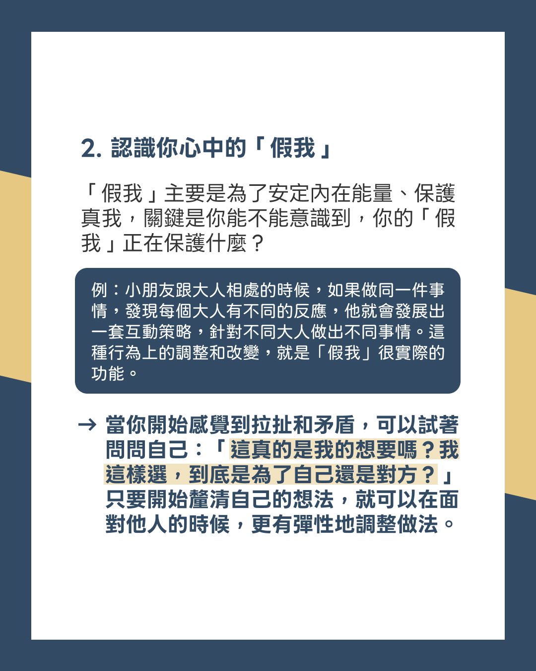 ※「假我」並不需要拿掉,因為每個人都有保護自己的需求,所以遇到衝突時,會想顧慮他人、調整自己,本來就是很合理的事。但如果沒有認出自己的「假我」,可能就會產生很多矛盾,覺得自己既要、又要、還要,不知道該怎麼選。