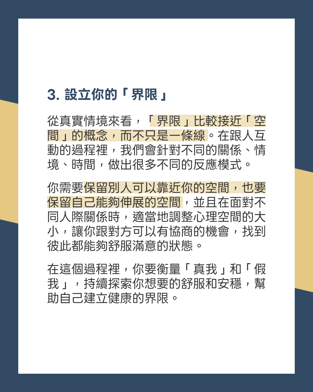 你需要保留別人可以靠近你的空間,也要保留自己能夠伸展的空間,並且在面對不同人際關係時,適當地調整心理空間的大小,讓你跟對方可以有協商的機會,找到彼此都能夠舒服滿意的狀態。在這個過程裡,你需要衡量「真我」和「假我」,持續探索你想要的舒服和安穩,幫助自己建立健康的界限。