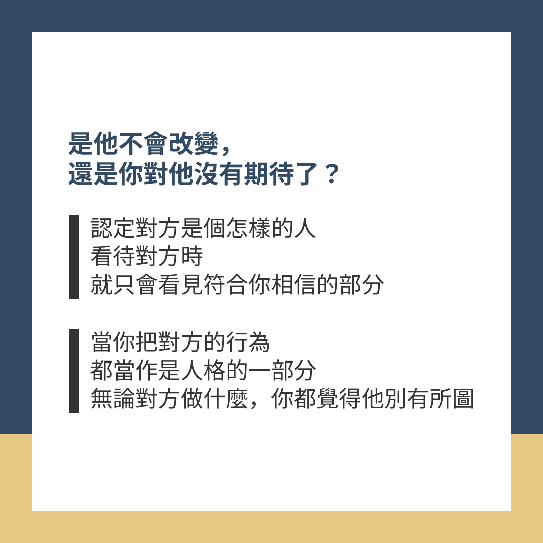 認定對方是個怎樣的人,看待對方時,就只會看見符合你相信的部分