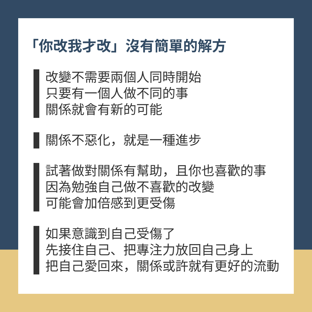 改變不需要兩個人同時開始,只要有一個人做不同的事,關係就會有新的可能