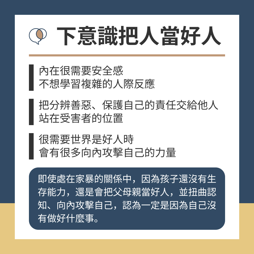 即使處在家暴的關係中,因為孩子還沒有生存能力,還是會把父母親當好人,並扭曲認知認為自己是壞小孩(一定是我沒有做好什麼事)。