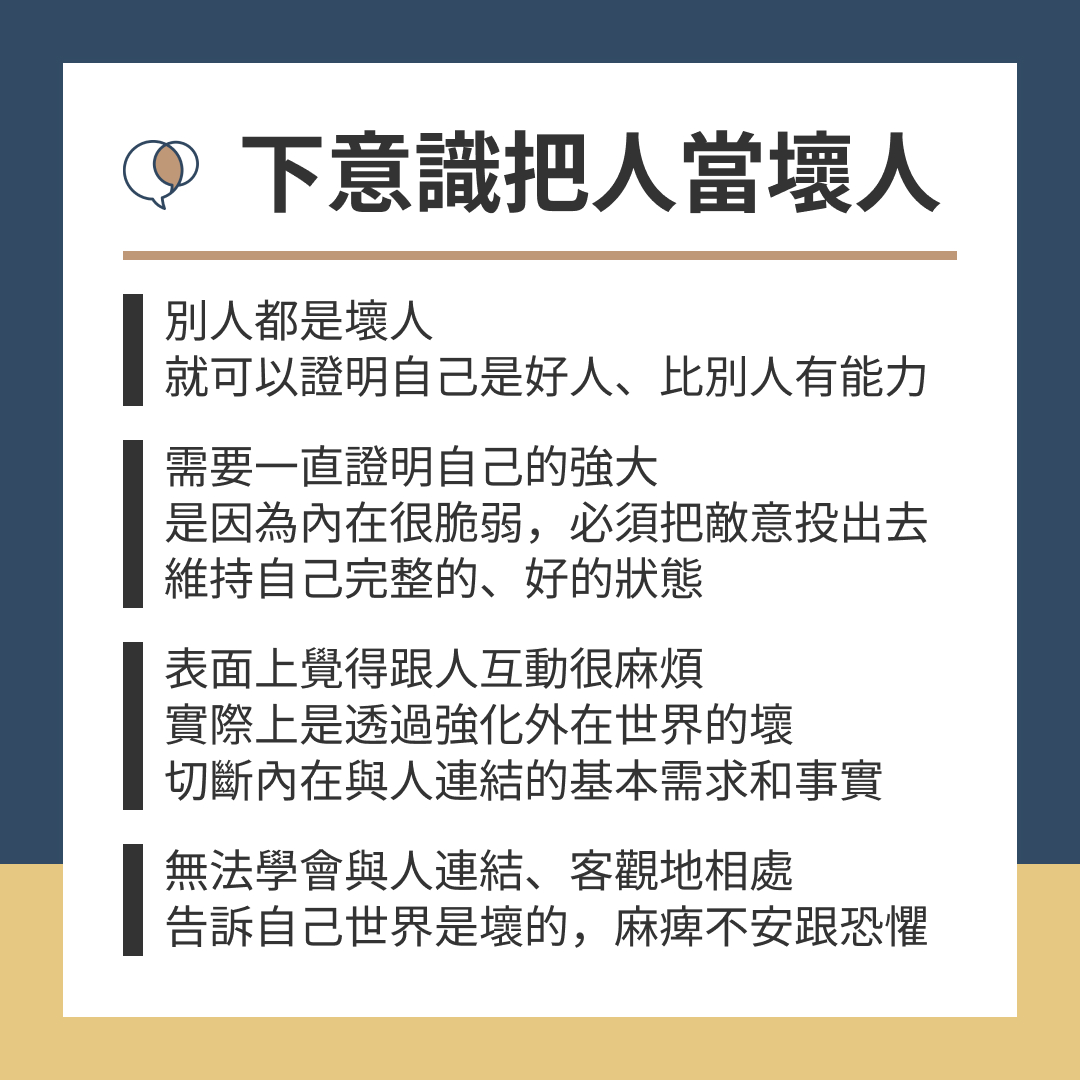 表面上覺得跟人互動很麻煩、認為一個人比較舒服,實際上是透過強化外在世界的壞,切斷內在與人連結的基本需求和事實