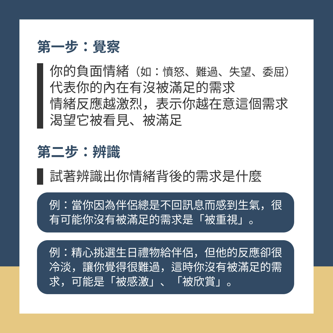 例:當你看到伴侶總是不回訊息而感到生氣,很有可能你沒有被滿足的需求是「被重視」。