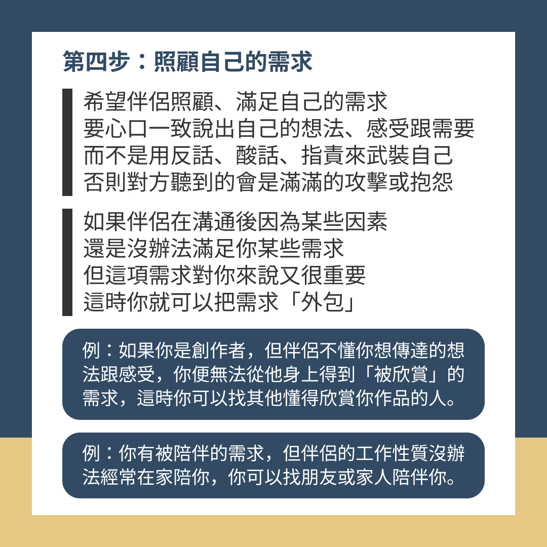 要伴侶照顧、滿足自己的需求,最重要的是能心口一致說出自己的想法、感受跟需要,而不是用反話、酸話或指責的方式武裝自己,否則對方聽到的不會是你的真實需求,而是滿滿的攻擊或抱怨