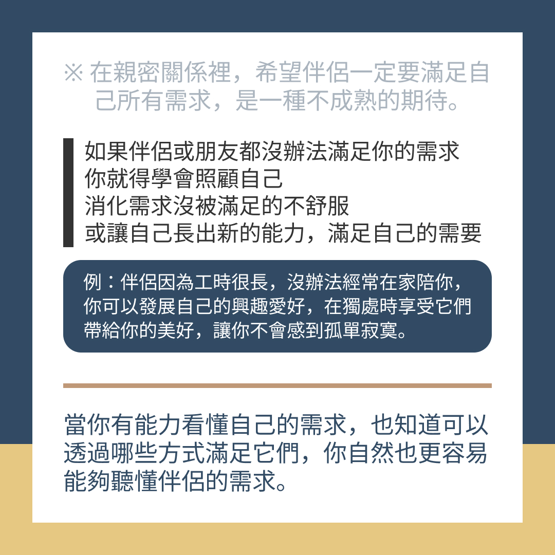 如果你的伴侶或身邊的朋友,都沒辦法滿足你的需求,你就得學會照顧自己,學習自己消化需求沒被滿足的不舒服,或讓自己長出新的能力,來滿足自己的需要