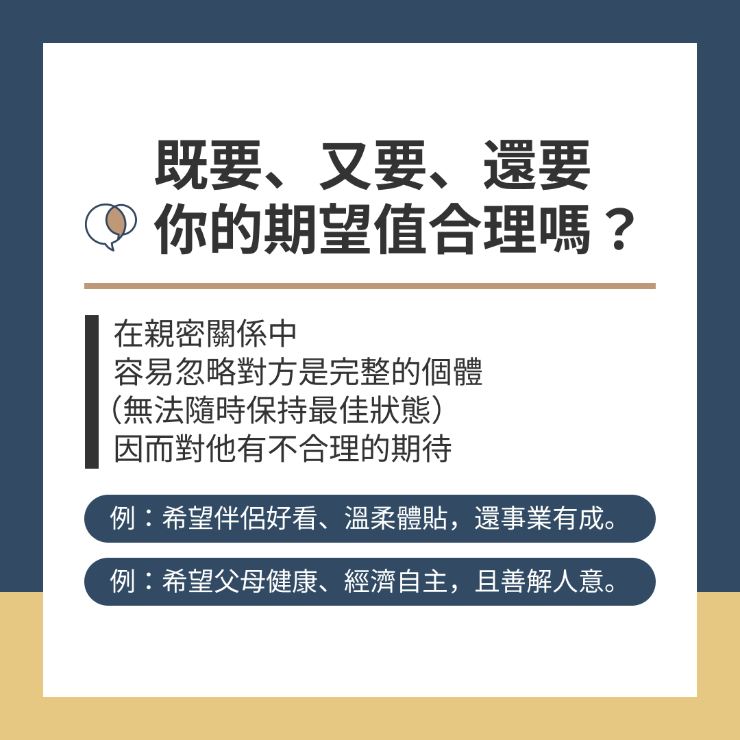 在親密關係中,容易忽略對方是完整的個體(無法隨時保持最佳狀態),而對對方有不合理的期待