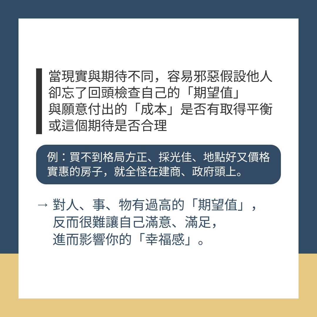 → 對人、事、物有過高的「期望值」,反而很難讓自己滿意、滿足,進而影響你的「幸福感」。