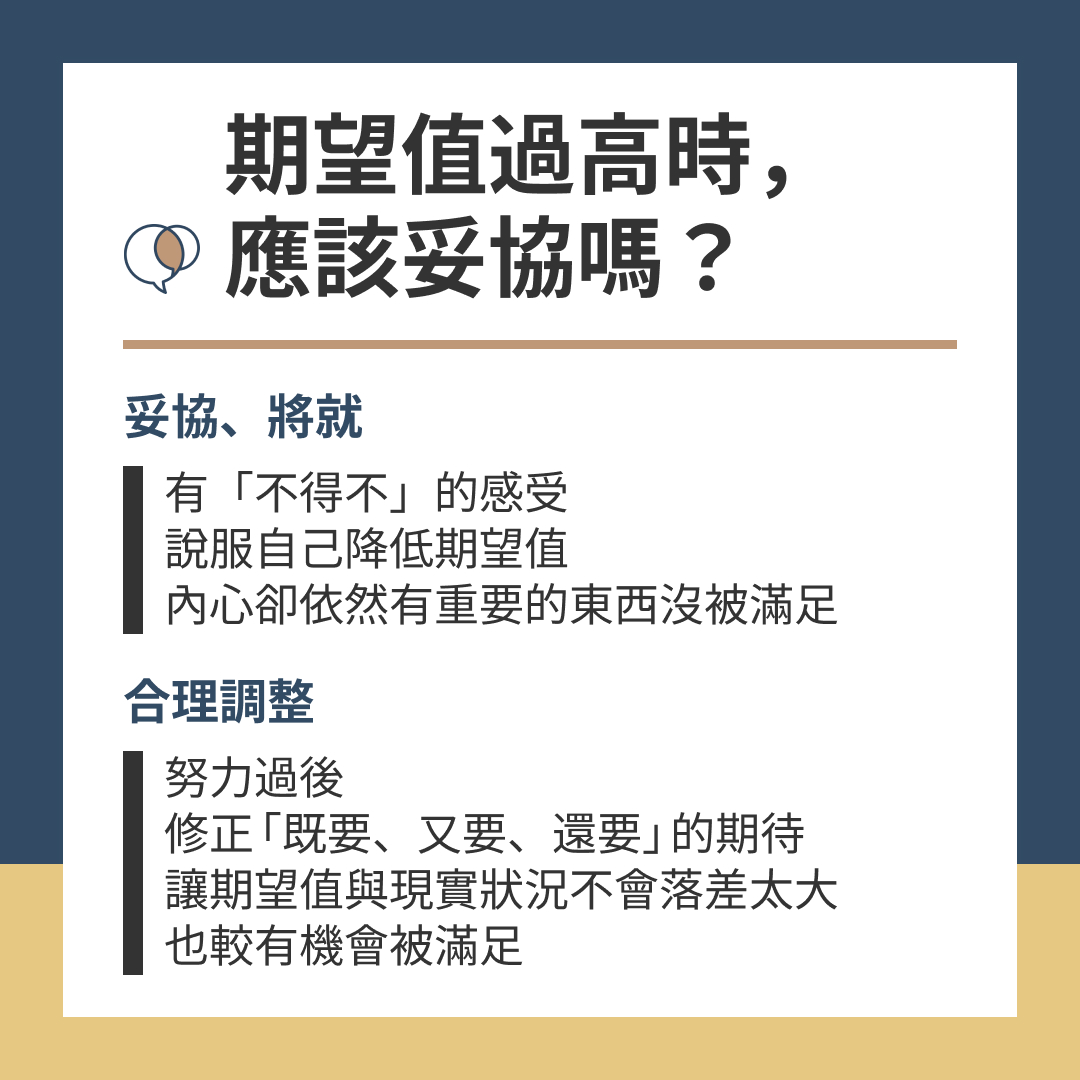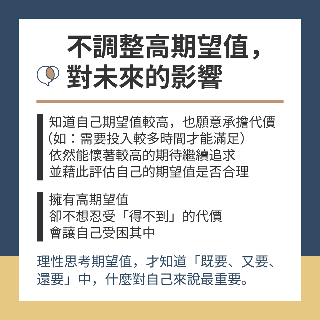 知道自己期望值較高,也願意承擔背後的代價(如:需要投入較多時間才能滿足),依然能懷著較高的期待繼續追求,並藉此評估自己的期望值是否合理