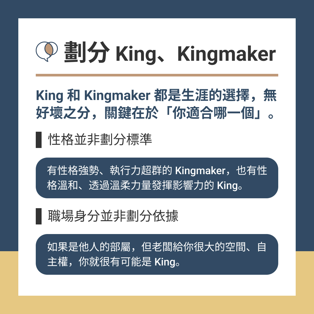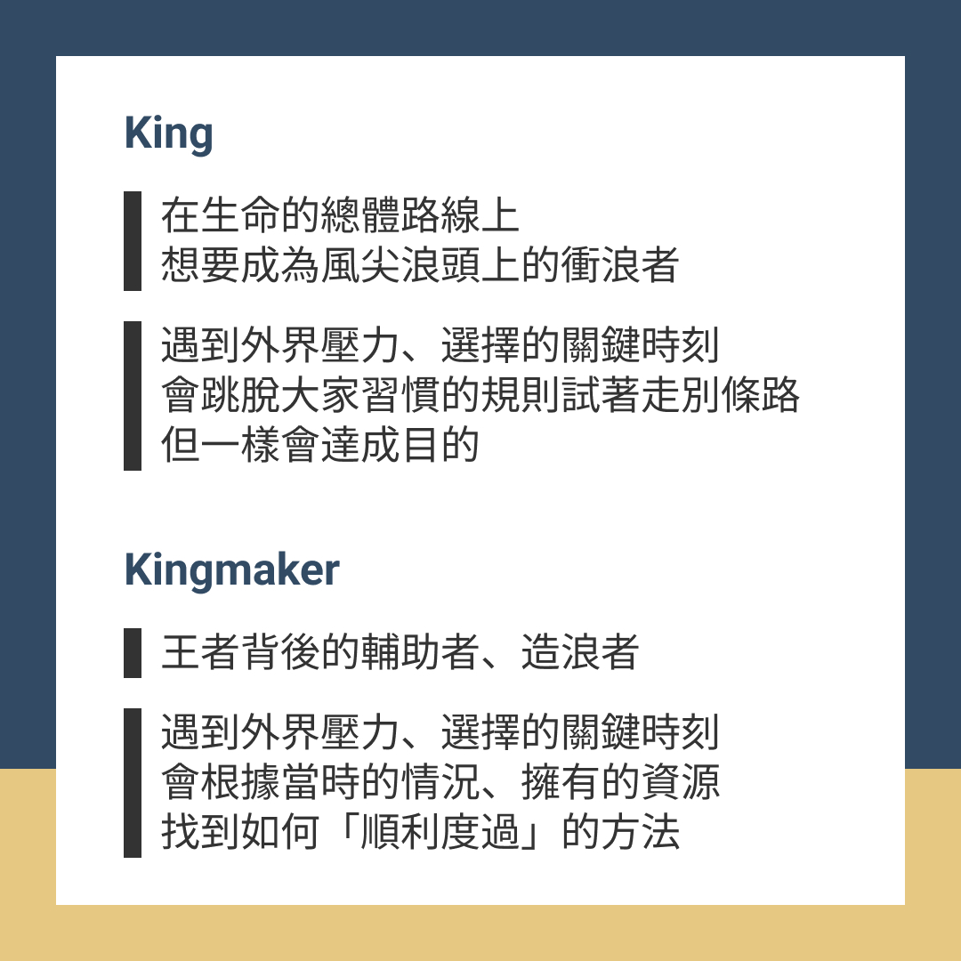 King不一定是領導人,而是面對壓力會選擇另闢蹊徑(職場身分也不是King、Kingmaker的劃分依據)