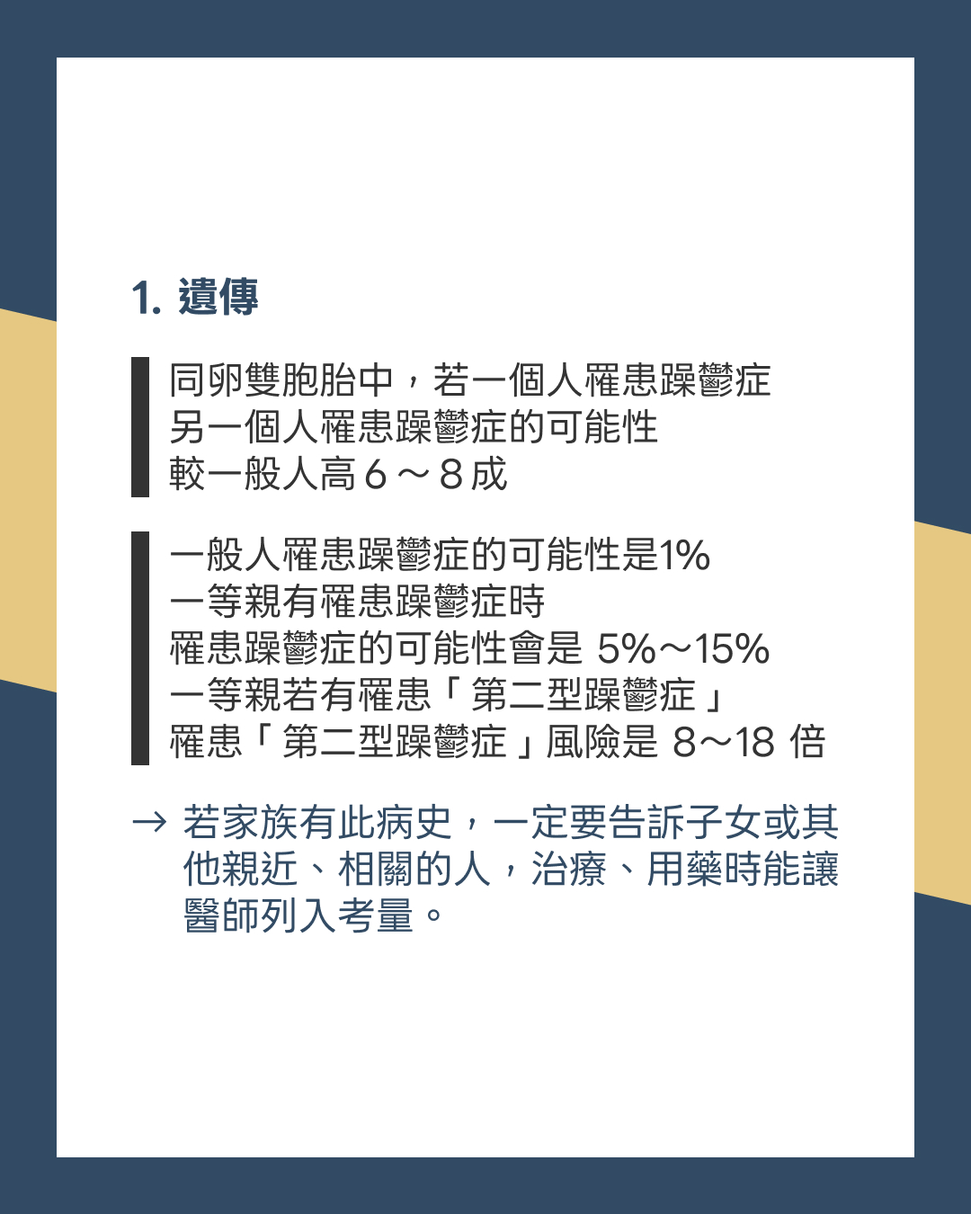一等親有罹患躁鬱症時,自己罹患躁鬱症的可能性是 5%~15%(一般人是1%);一等親若有罹患「第二型躁鬱症」,自己罹患「第二型躁鬱症」的風險是 8~18 倍