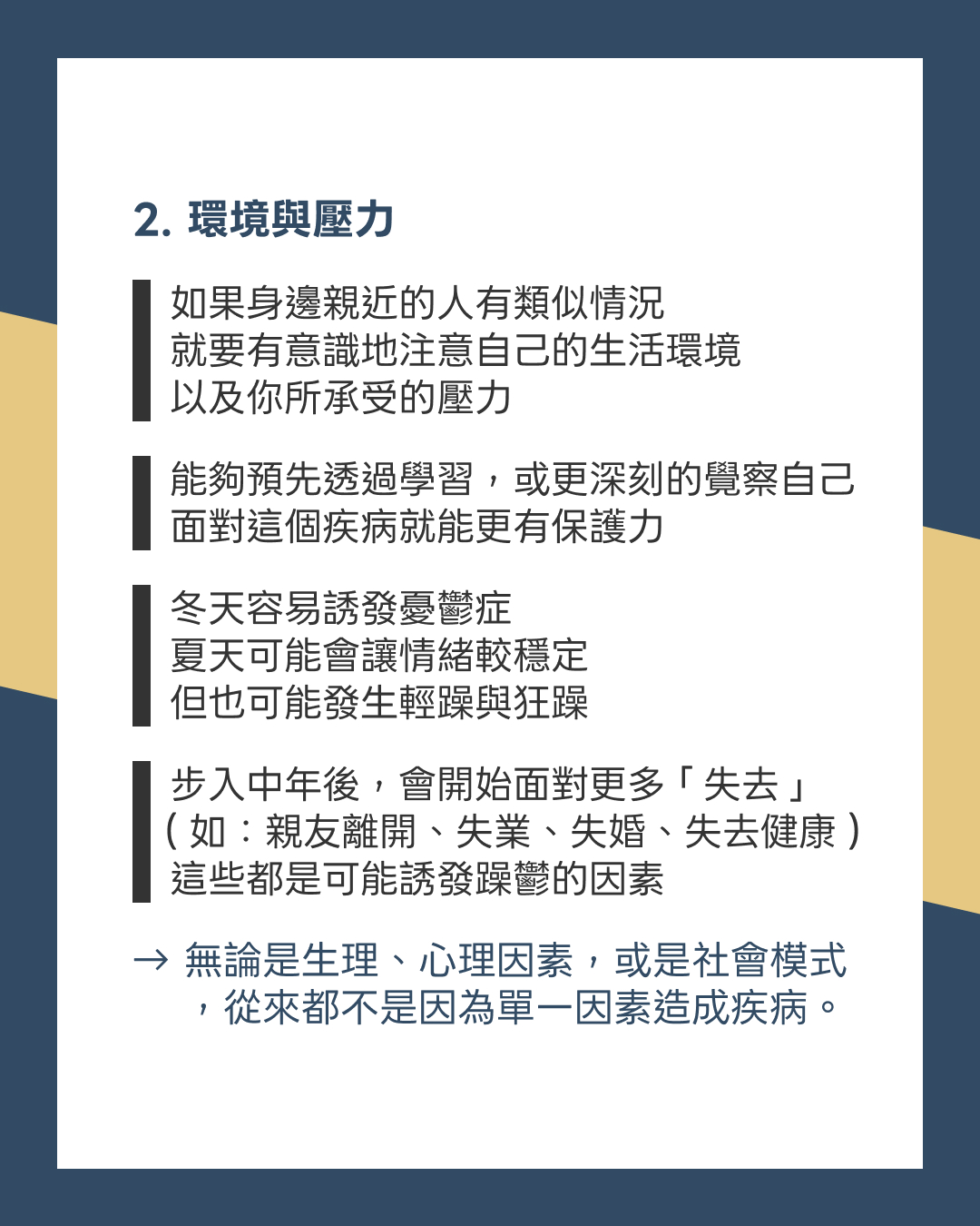 步入中年後,會開始面對更多「失去」(如:親友離開、失業、失婚、失去健康…),這些都是可能誘發躁鬱的因素