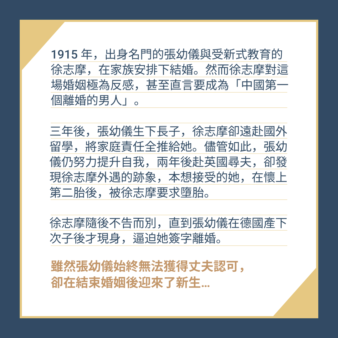 婚後三年,張幼儀產下一子,徐志摩卻選擇到國外留學,將照顧一家老小的責任都推給張幼儀。儘管張幼儀努力進修、提升自我,卻始終無法贏得徐志摩的認可。