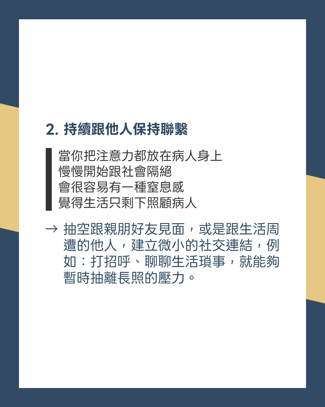 抽空跟親朋好友見面,或是跟生活周遭的他人,建立微小的社交連結,如:打招呼、聊聊生活瑣事,就能夠暫時抽離長照的壓力,不會一直陷在裡面