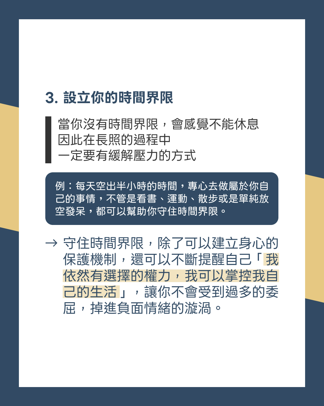 守住時間界限,除了可以建立身心的保護機制,還可以不斷提醒自己:「我依然有選擇的權力,我可以掌控我自己的生活」,讓你不會受到過多的委屈,掉進負面情緒的漩渦