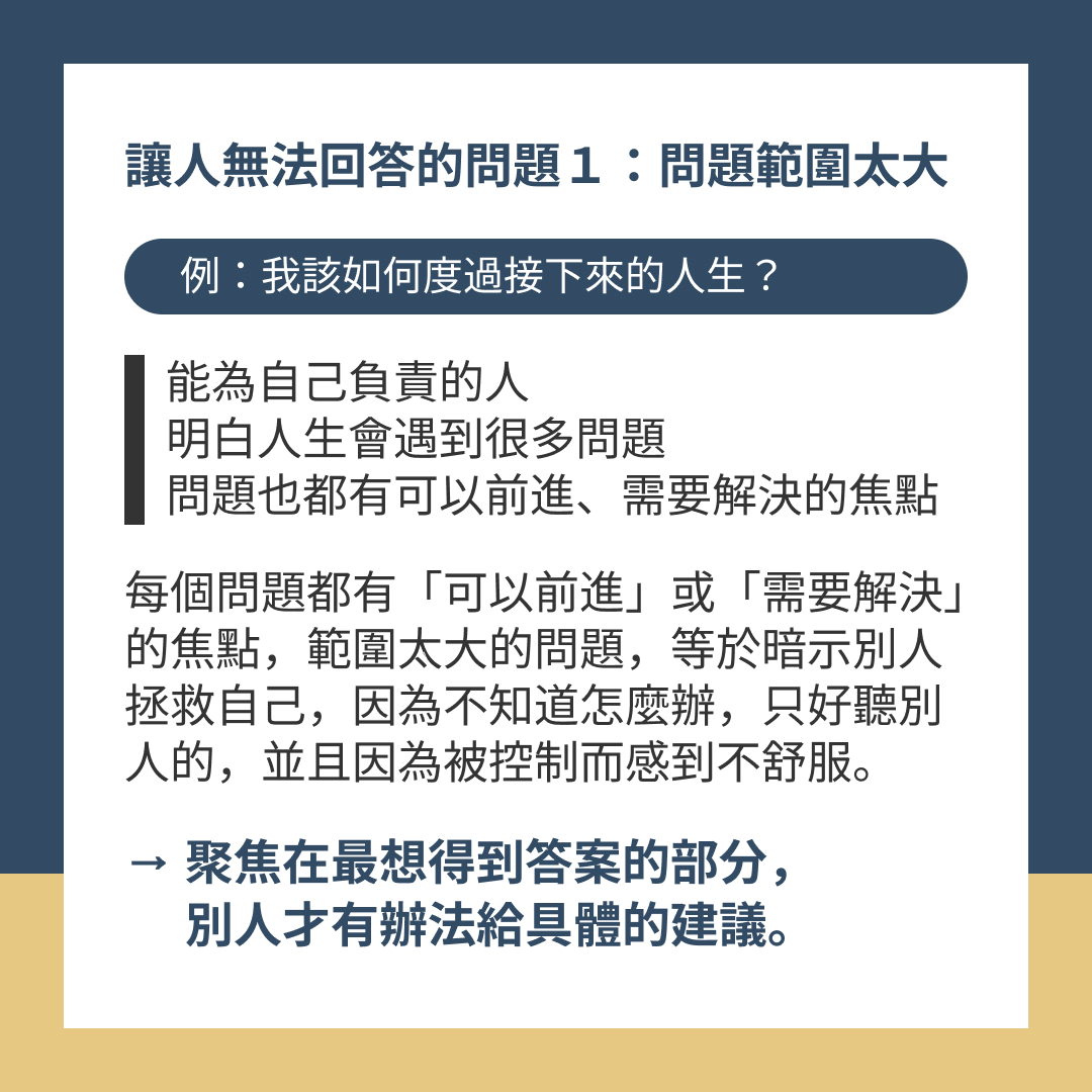 每個問題都會有「可以前進」或「需要解決」的焦點,而範圍太大的問題,等於暗示別人來拯救自己,因為不知道該怎麼辦,只好活在別人的控制裡(聽別人的),並且因為被控制而感到不舒服