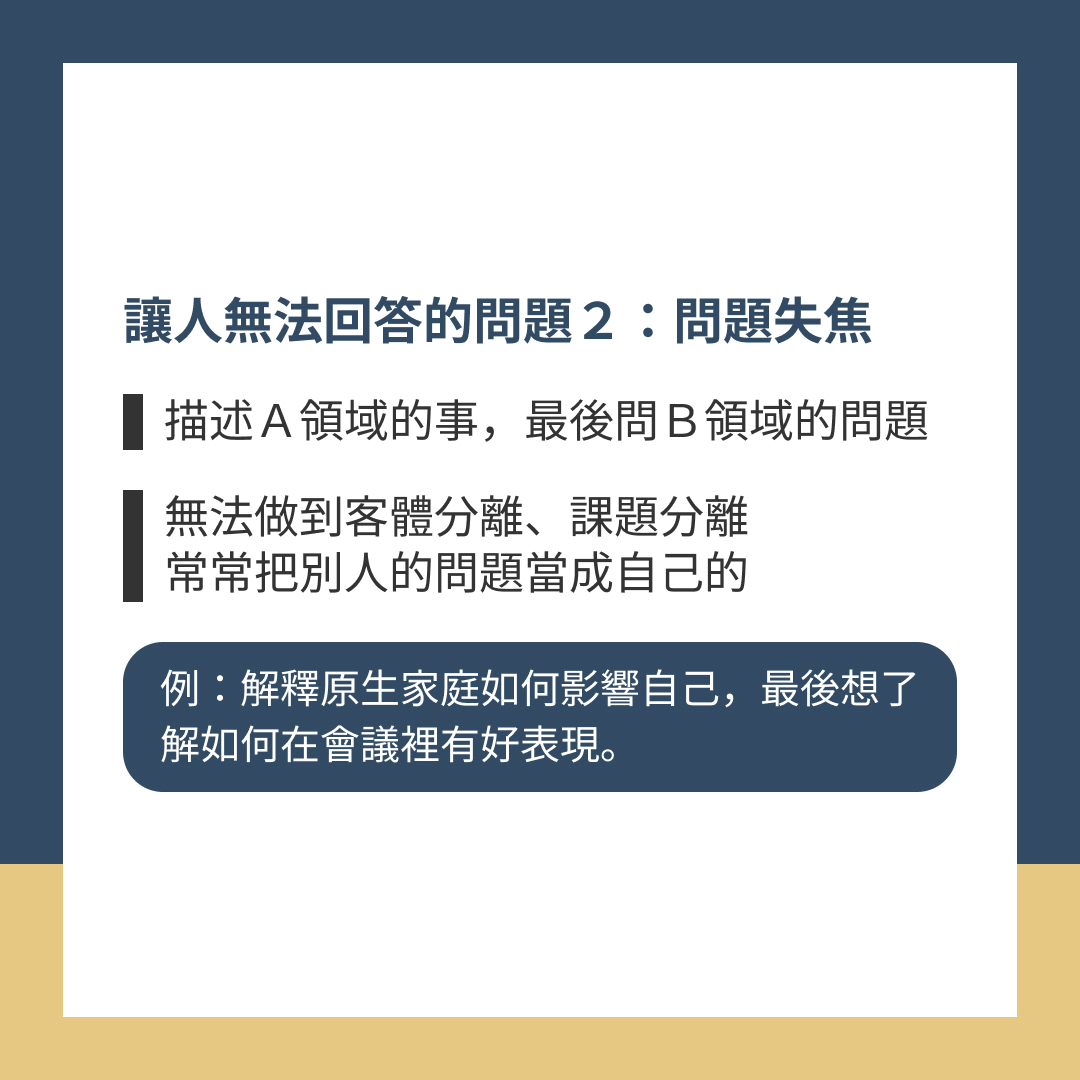 例:解釋原生家庭如何影響自己,最後想了解如何在會議裡有好表現。