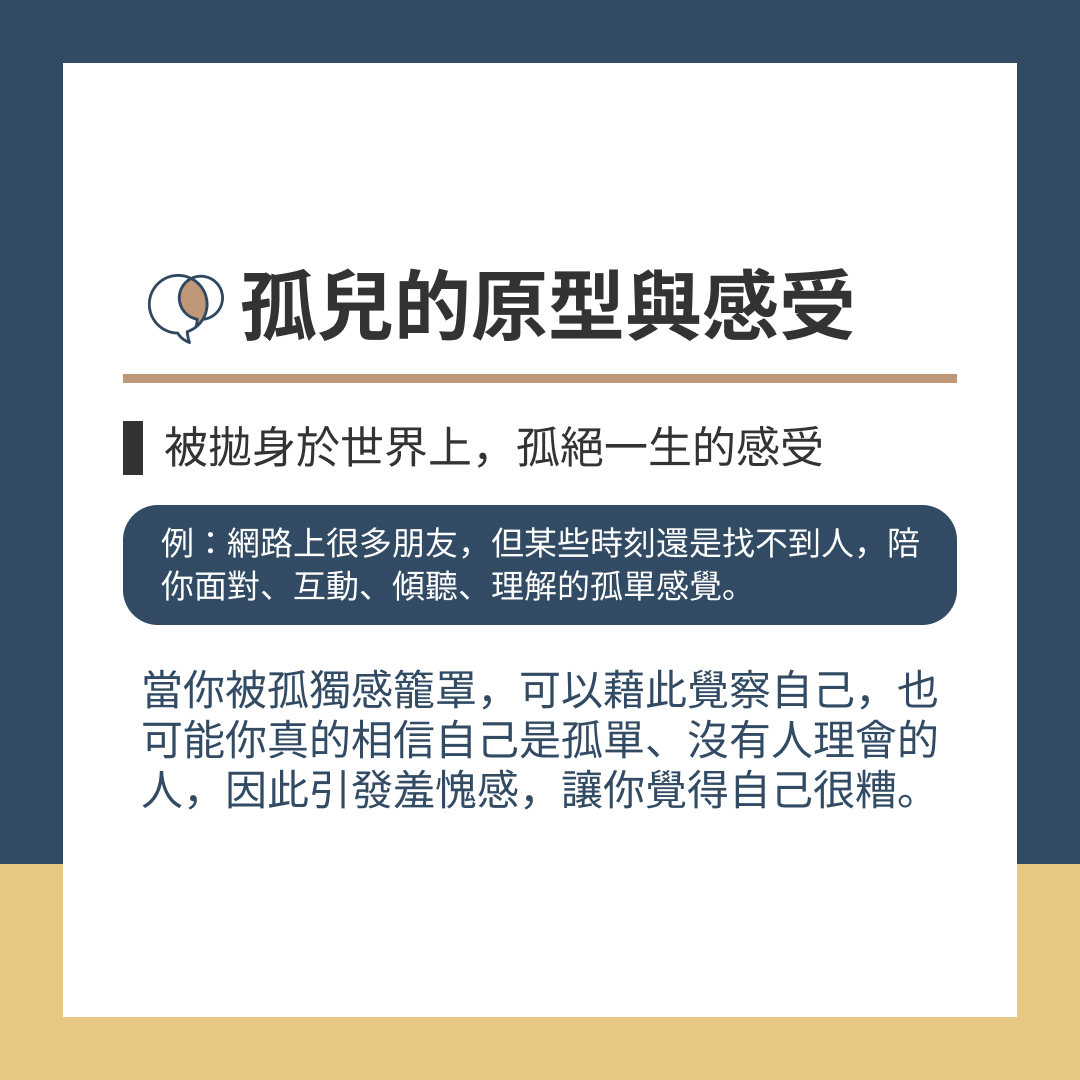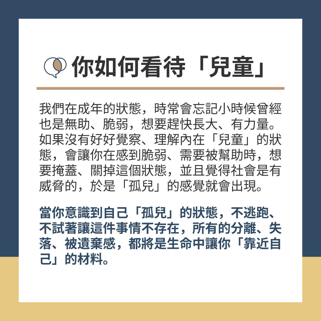 我們在成年的狀態,時常會忘記小時候曾經也是無助、脆弱,想要趕快長大、有力量。如果沒有好好覺察、理解內在「兒童」的狀態,會讓你在感到脆弱、需要被幫助時,想要掩蓋、關掉這個狀態,並且覺得社會是有威脅的,於是「孤兒」的感覺就會出現。