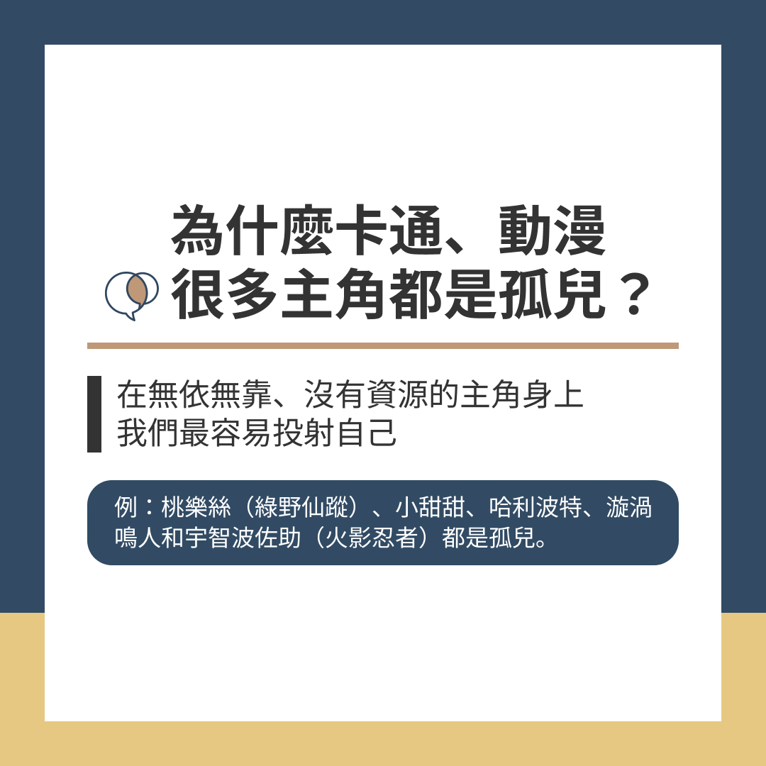 例:桃樂絲(綠野仙蹤)、小甜甜、哈利波特、漩渦鳴人和宇智波佐助(火影忍者)都是孤兒。