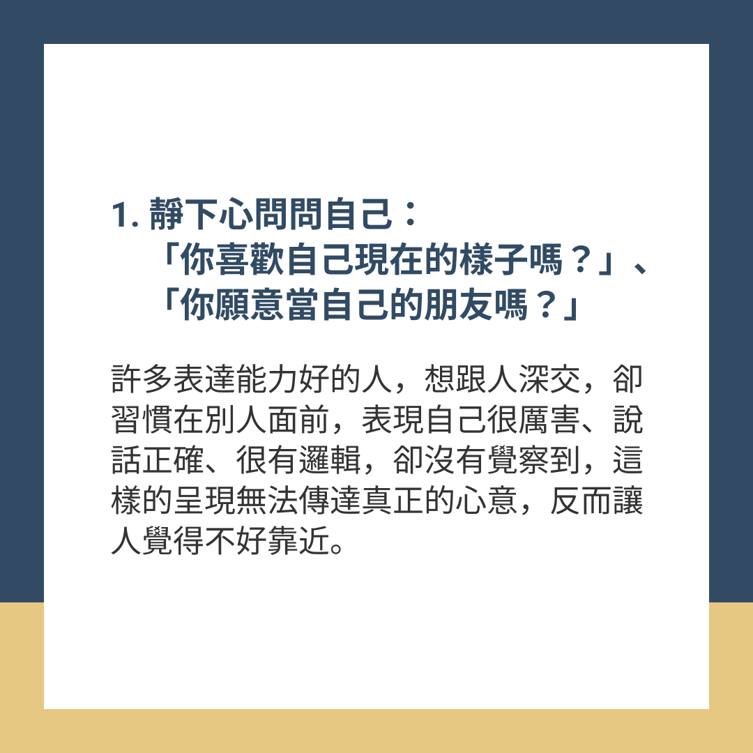 許多表達能力好的人,想跟人深交,卻習慣在別人面前,表現出自己很厲害、說話正確、很有邏輯,卻沒有覺察到,這樣的呈現沒辦法傳達真正的心意,反而讓人覺得不好靠近
