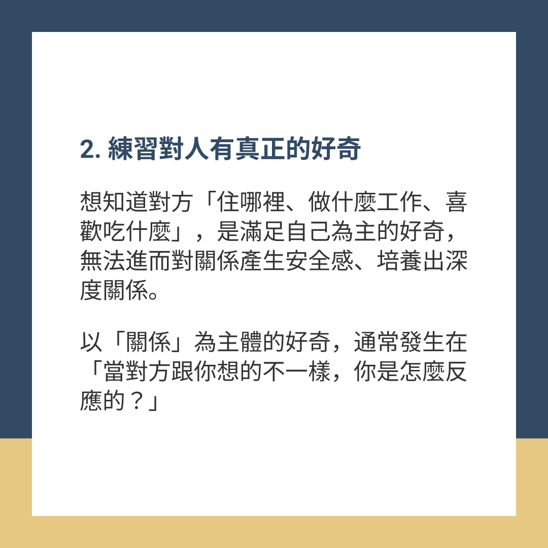想知道對方「住哪裡、做什麼工作、喜歡吃什麼」,是滿足自己為主的好奇,無法進而對關係產生安全感、培養出深度關係
