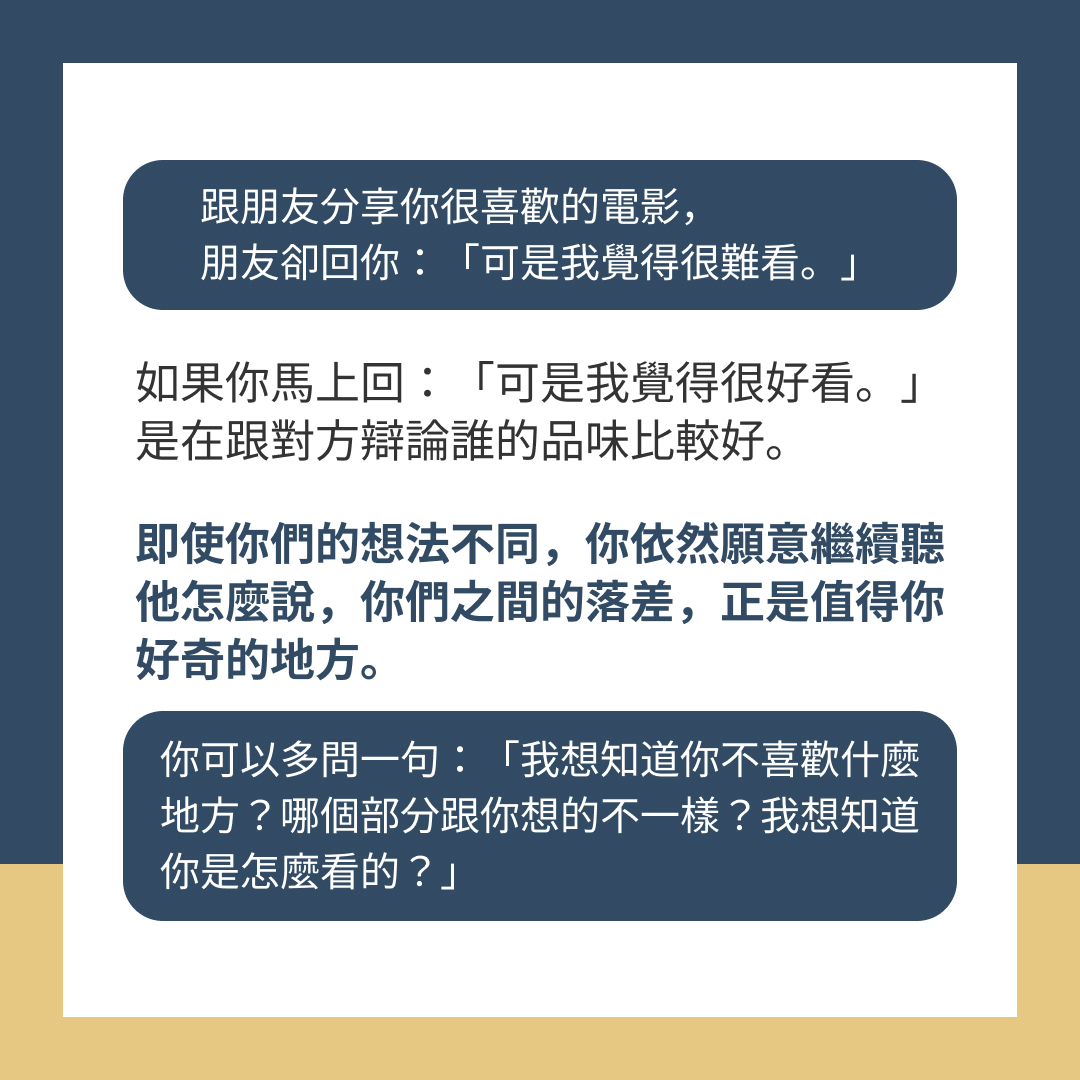 如果你馬上回:「可是我覺得很好看。」是在跟對方辯論誰的品味比較好