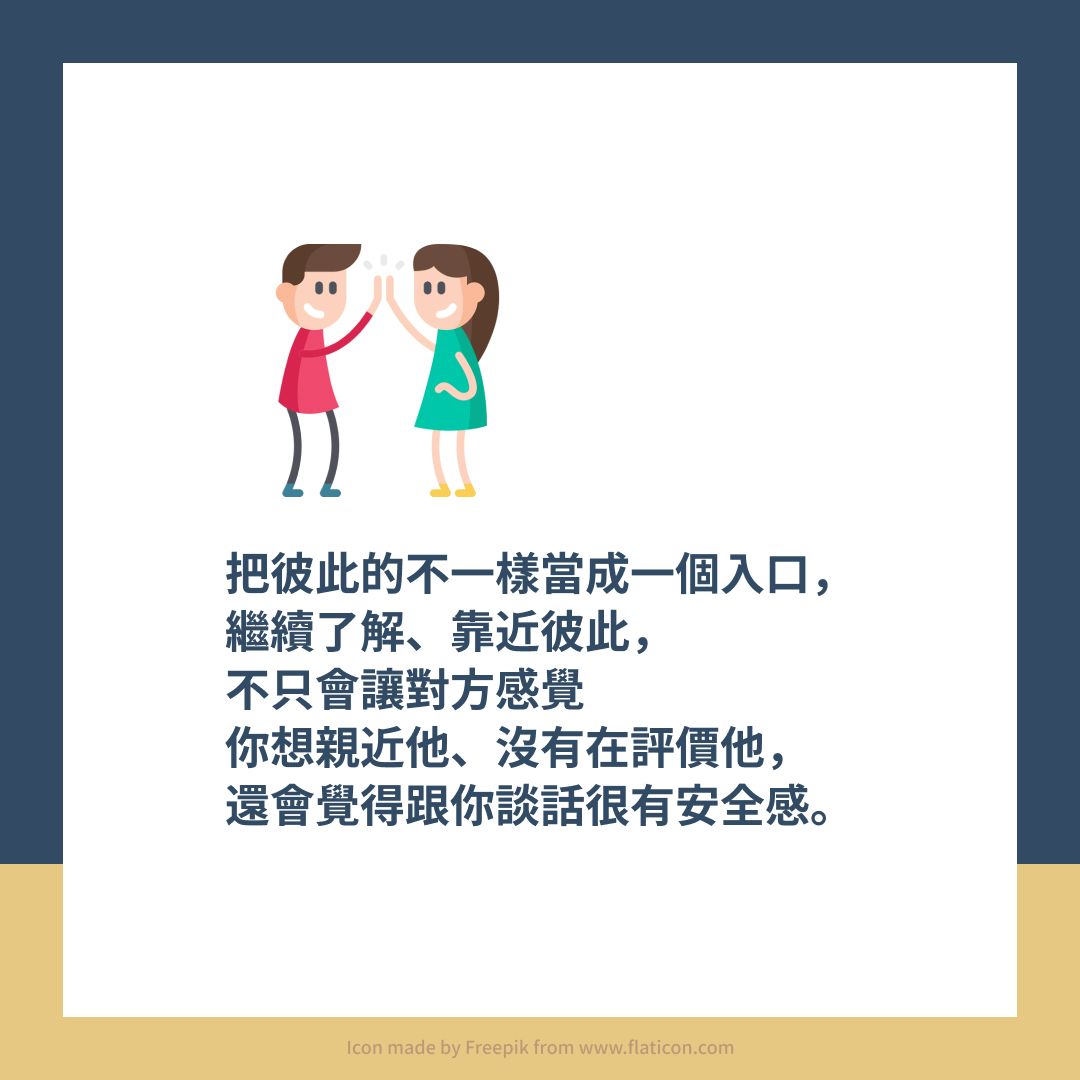 把彼此的不一樣當成一個入口,繼續了解、靠近彼此,不只會讓對方感覺你想親近他、沒有在評價他,還會覺得跟你談話很有安全感。