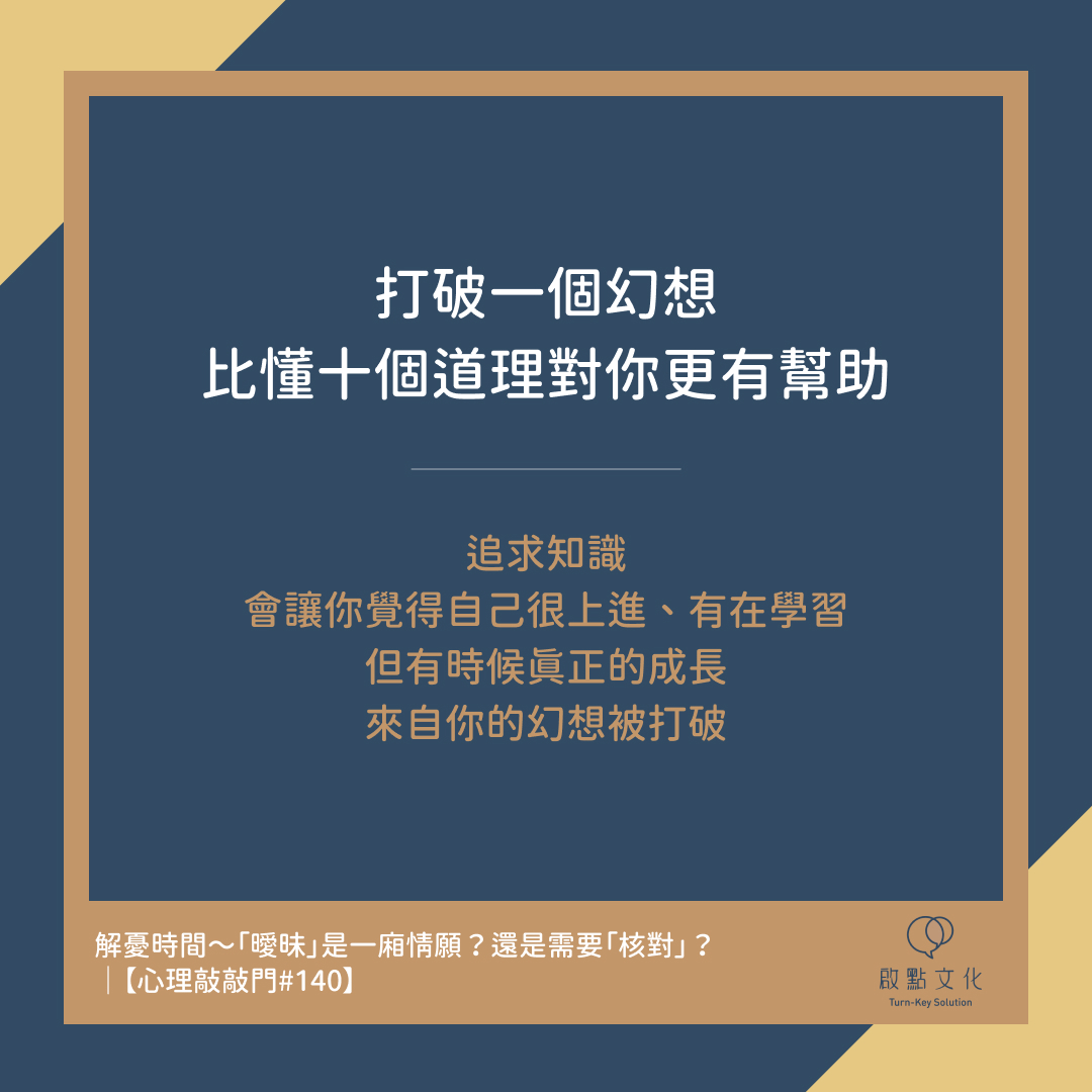 追求知識,會讓你覺得自己很上進、有在學習,但有時候真正的成長,來自你的幻想被打破,這可能會讓你不舒服、有挫折,但如果你可以接受、做到,就比「知道」一個道理更重要。