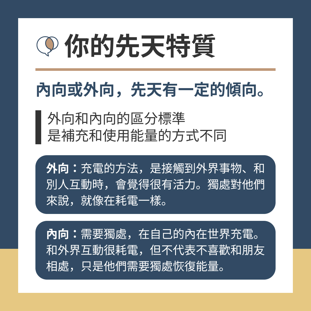 天生內向的人成長在外放、外向的家庭和文化,成長過程就會需要整合這兩種不同的影響。如果你覺得自己常常判若兩人、兼具內向和外向,可以思考是不是文化和先天特質,同時在影響你。