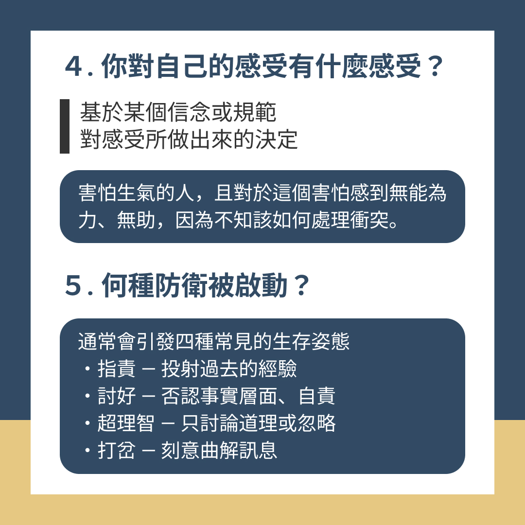 通常會引發四種常見的生存姿態:指責(投射過去的經驗)、討好(否認事實層面、自責)、超理智(只討論道理或忽略)、打岔(刻意曲解訊息)