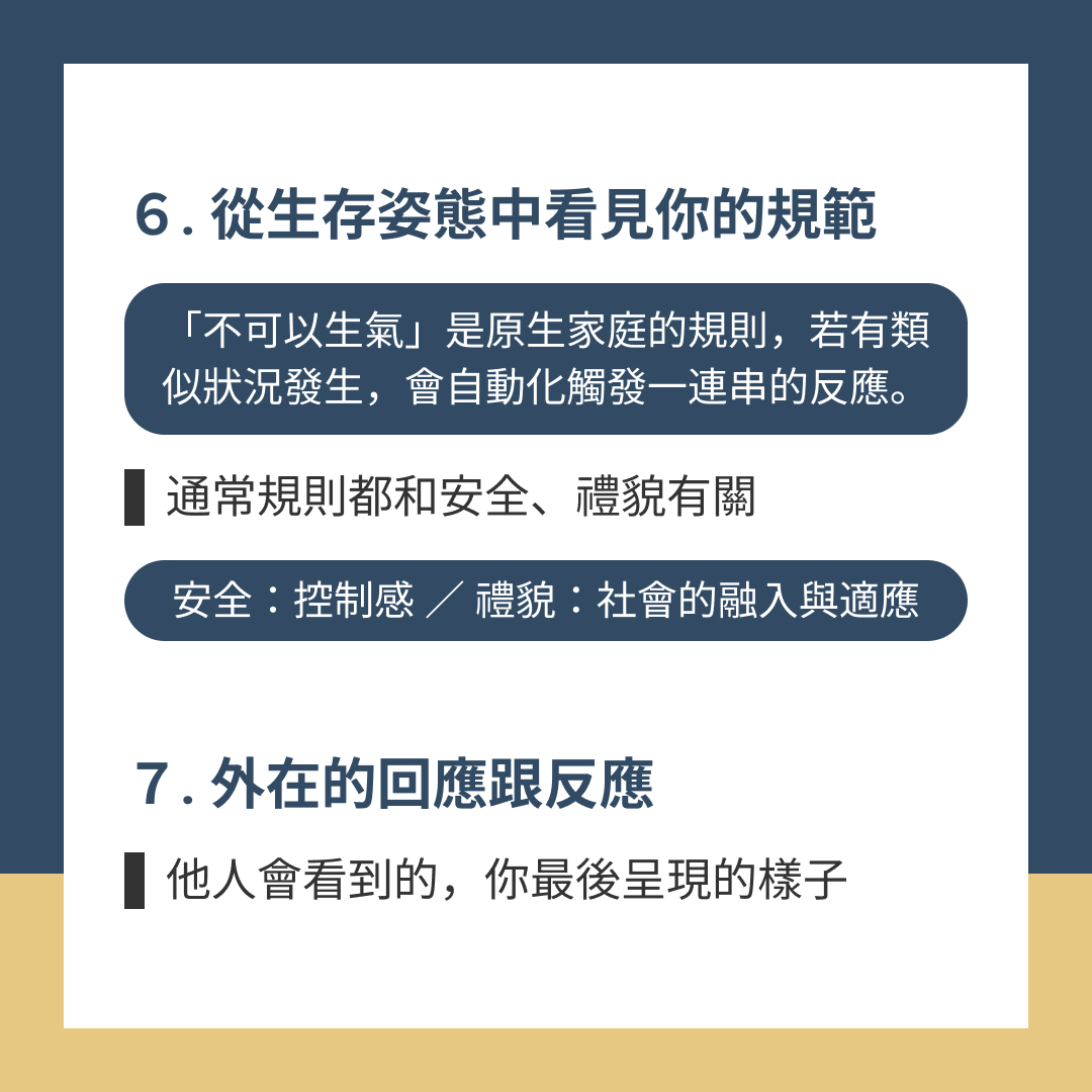 例:「不可以生氣」是原生家庭的規則,若有類似狀況發生,會自動化觸發一連串的反應。