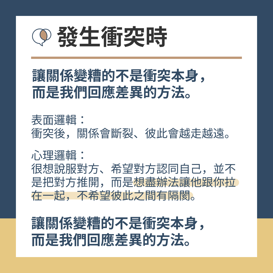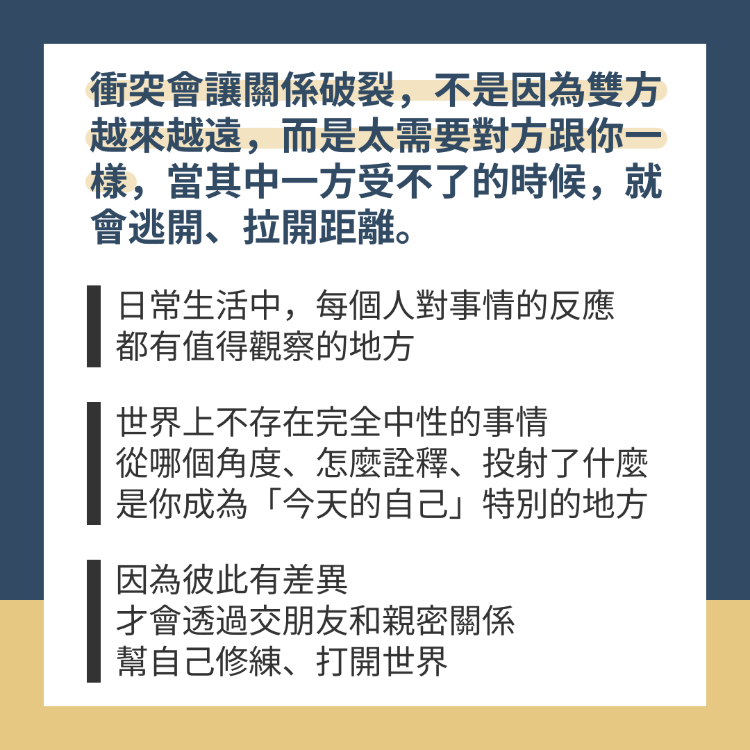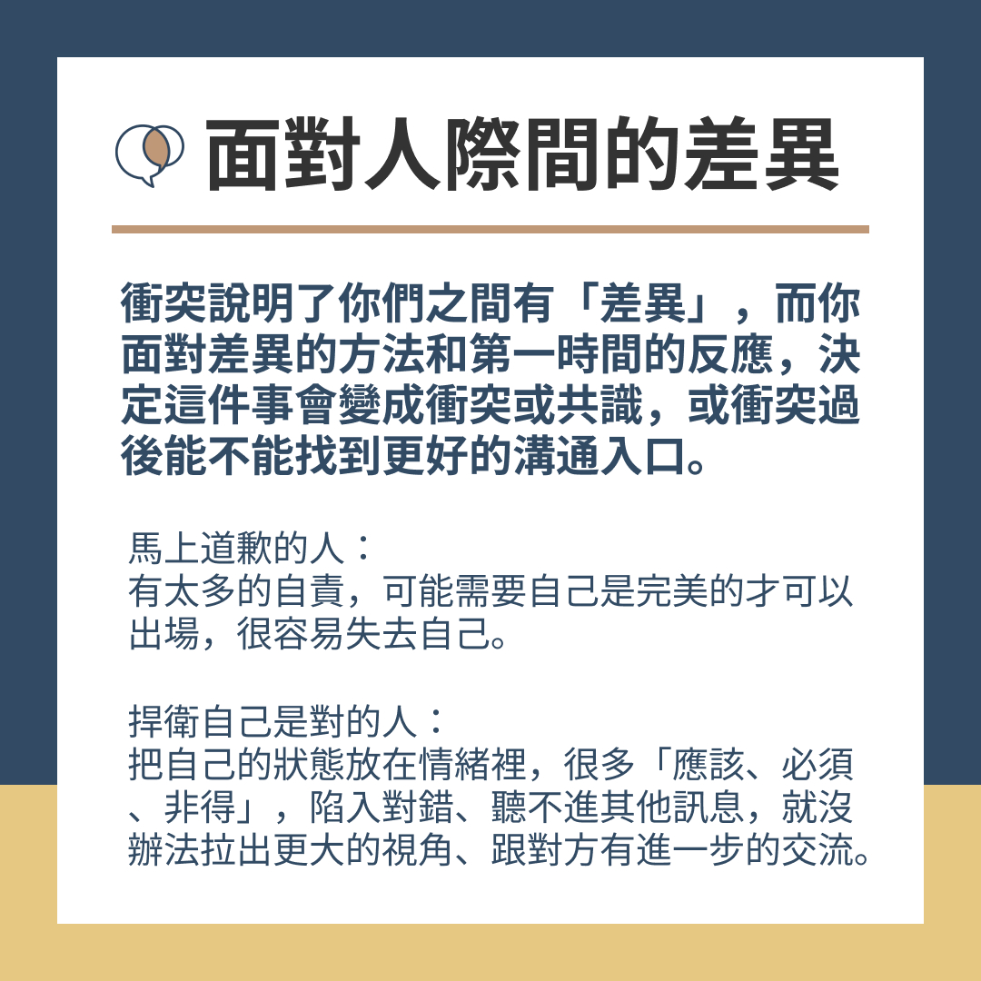 當你們之間有衝突發生,說明你們之間有「差異」,而面對差異的方法和第一時間的反應,決定了這件事會不會變成衝突或共識,或是衝突過後,能不能找到更好的溝通入口。