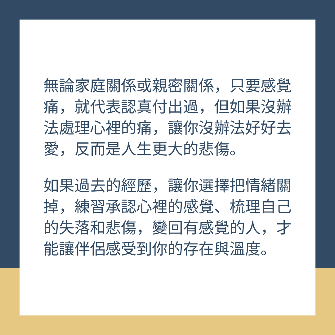 無論家庭關係或親密關係,只要感覺痛,就代表認真付出過,但如果沒辦法處理心裡的痛,讓你沒辦法好好去愛,反而是人生更大的悲傷。