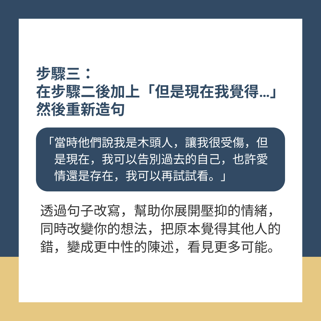 透過句子的改寫,幫助你展開壓抑多年的情緒,同時改變你的想法,把原本覺得其他人的錯,變成更中性的陳述,看見更多可能