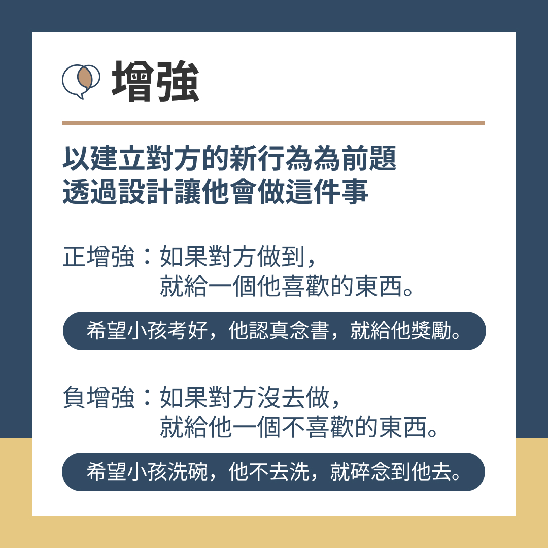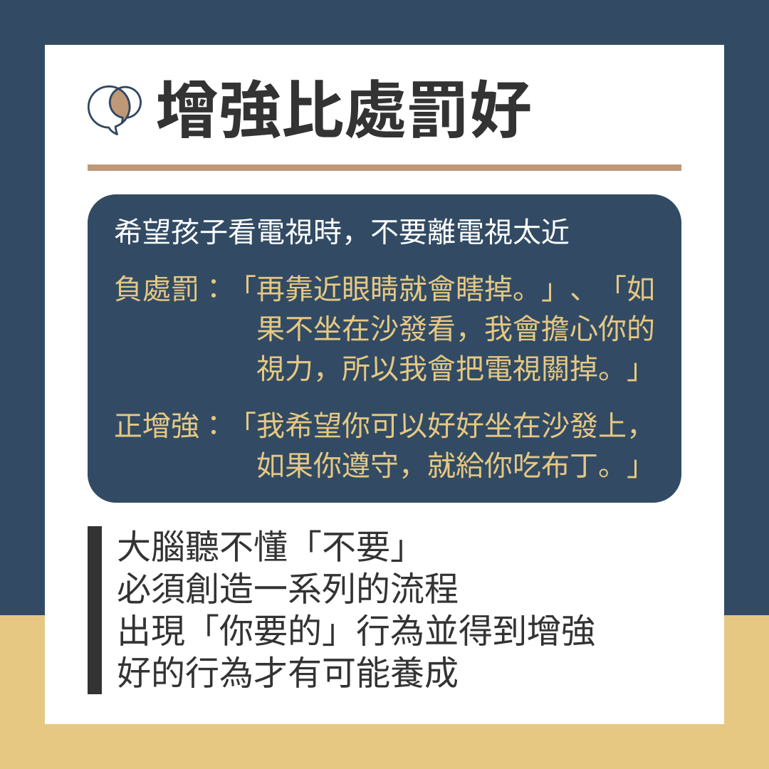 → 研究顯示,增強比處罰好,因為大腦聽不懂「不要」,必須創造一系列的流程,出現「你要的」並得到增強,好的行為才有可能出現。