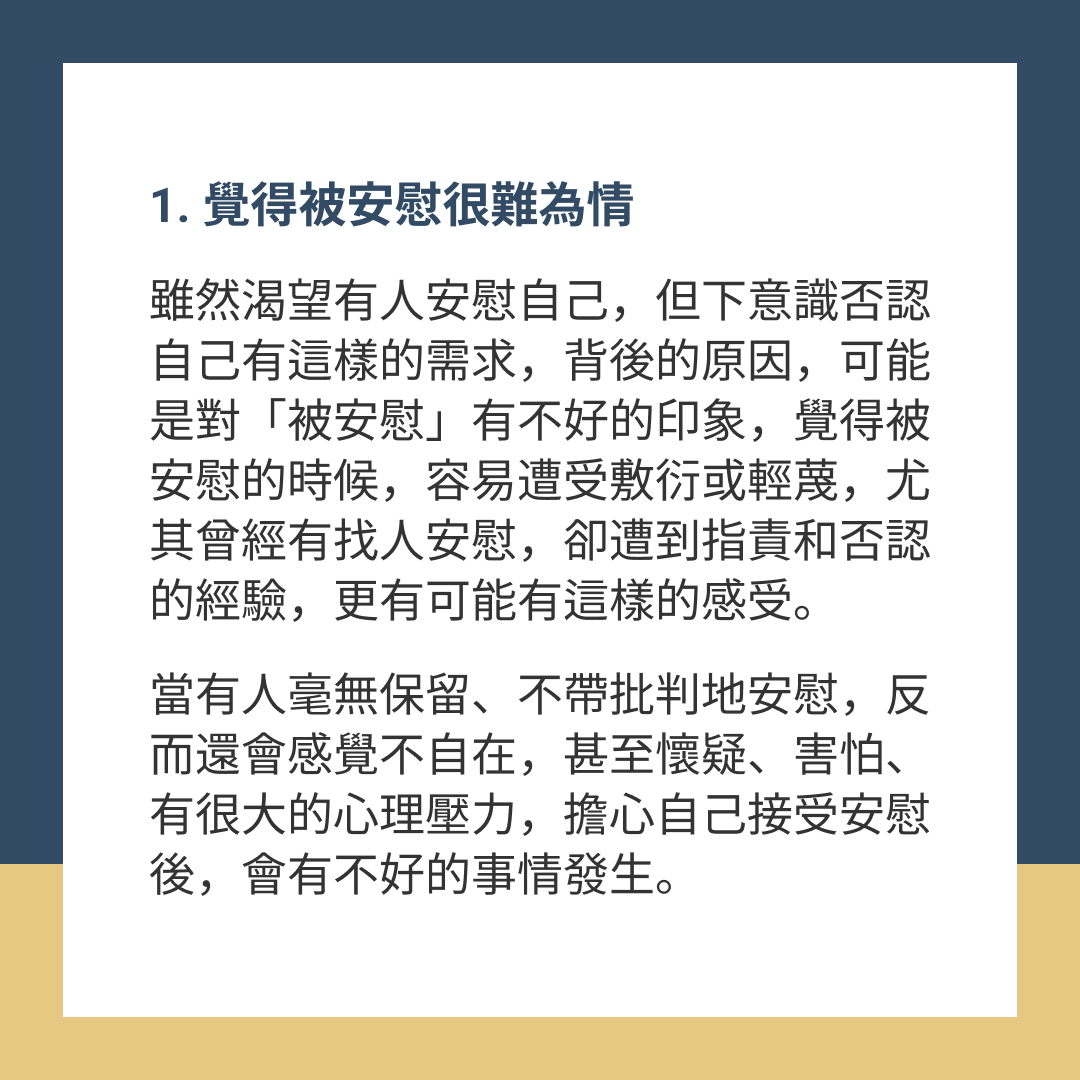 雖然渴望有人安慰自己,但心理防衛機轉,會讓人下意識否認自己有這樣的需求,背後的原因,可能是對「被安慰」有不好的印象,覺得被安慰的時候,很容易遭受別人的敷衍或輕蔑,尤其曾經有找人安慰,卻遭到指責和否認的經驗,更有可能有這樣的感受