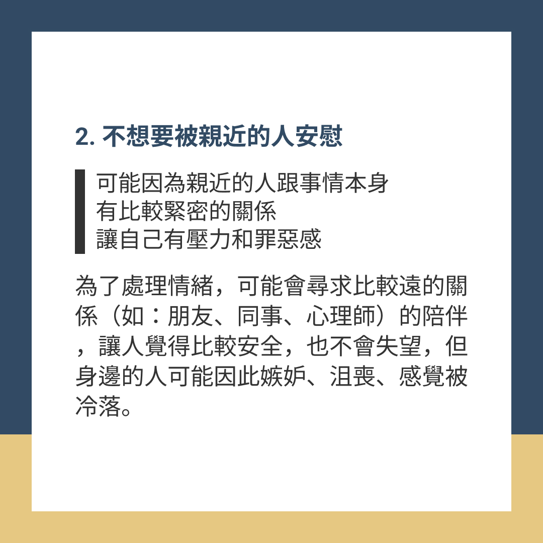為了處理情緒,可能會尋求比較遠的關係(如:朋友、同事、心理師)的陪伴,讓人覺得比較安全,也不會失望,但身邊的人可能因此嫉妒、沮喪、感覺被冷落