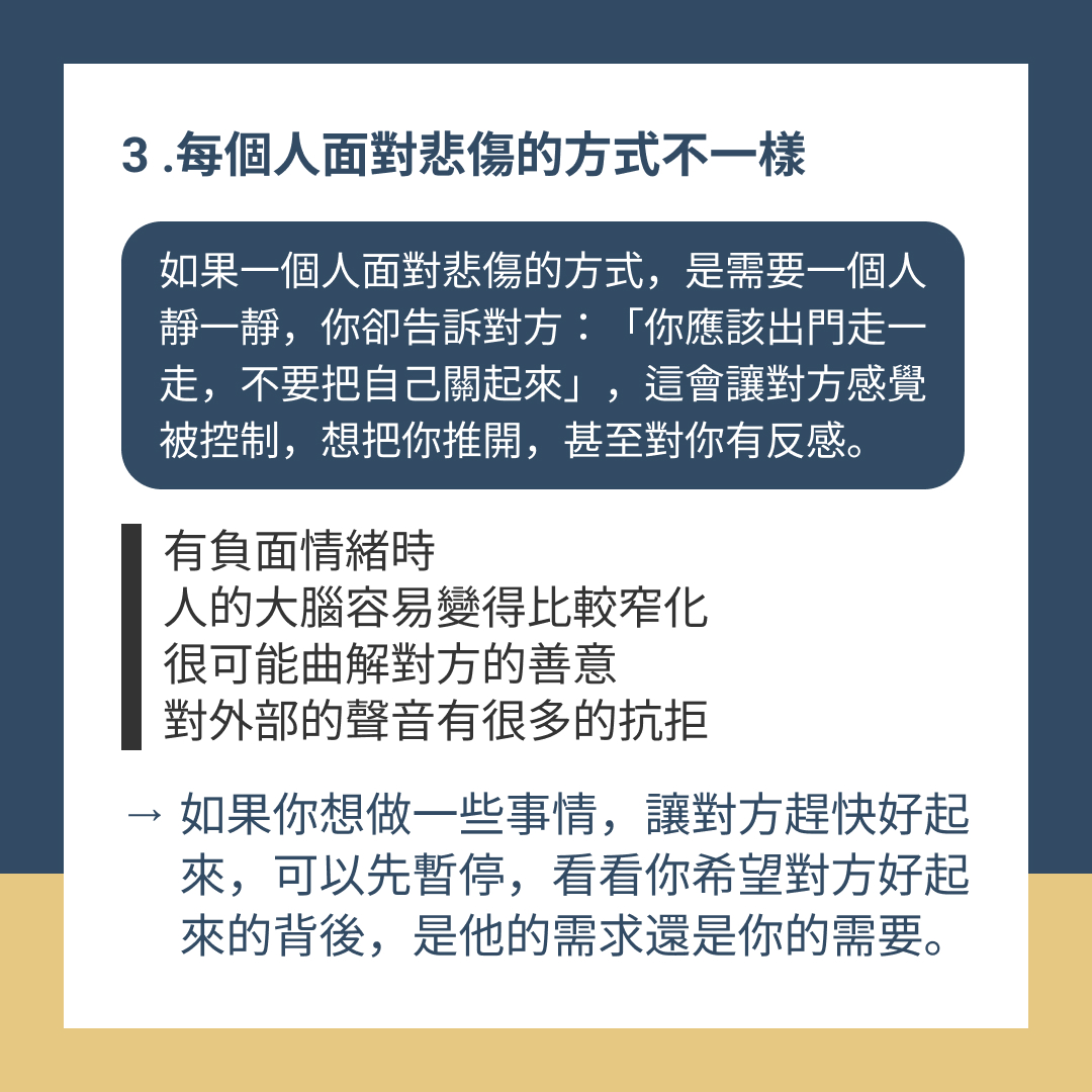 如果一個人面對悲傷的方式,是需要一個人靜一靜,你卻看不慣他死氣沉沉,於是告訴對方:「你應該出門走一走,不要把自己關起來」,這會讓對方感覺被控制,想把你推開,甚至對你有反感。