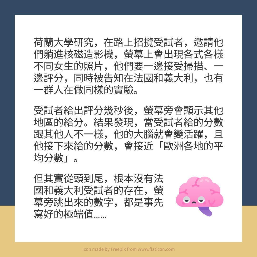 受試者給出評分的幾秒鐘後,螢幕旁會顯示其他地區的人給幾分。結果發現,當受試者給的分數跟團體不一樣,他的大腦就會變活躍,且他接下來給的分數,會接近「歐洲各地的平均分數」,但其實從頭到尾,就沒有法國和義大利受試者的存在,螢幕旁跳出來的數字,都是事先寫好的極端值。
