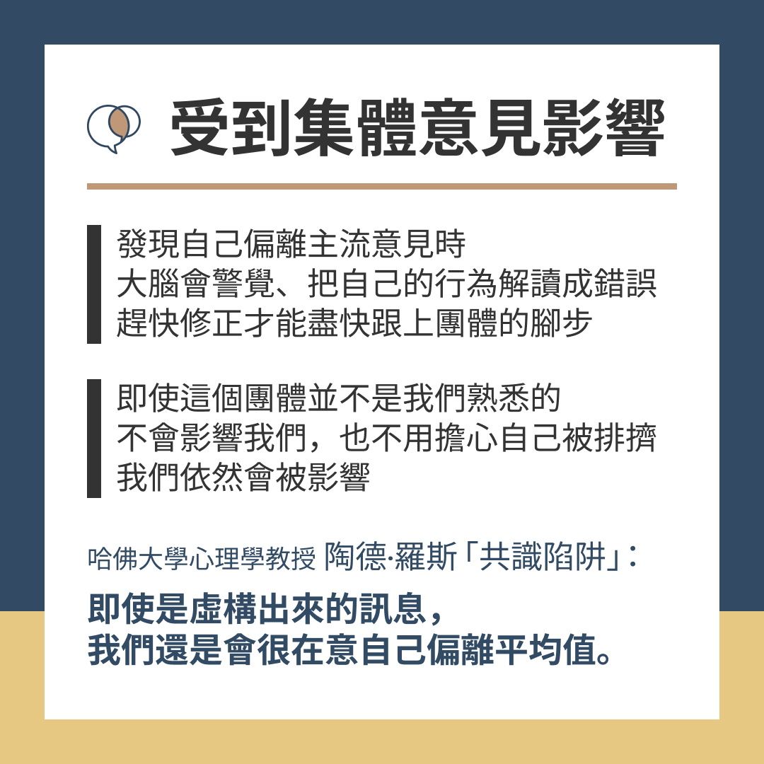 發現自己偏離主流意見時,大腦會開始警覺,把自己的行為解讀成錯誤,趕快修正才能盡快跟上團體的腳步