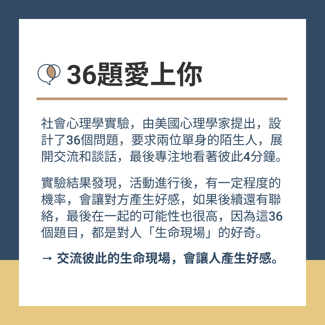 由美國心理學家提出的「社會心理學」實驗,設計了36個問題,要求兩位單身的陌生人,運用這36個問題,展開交流和談話,最後專注地看著彼此4分鐘。