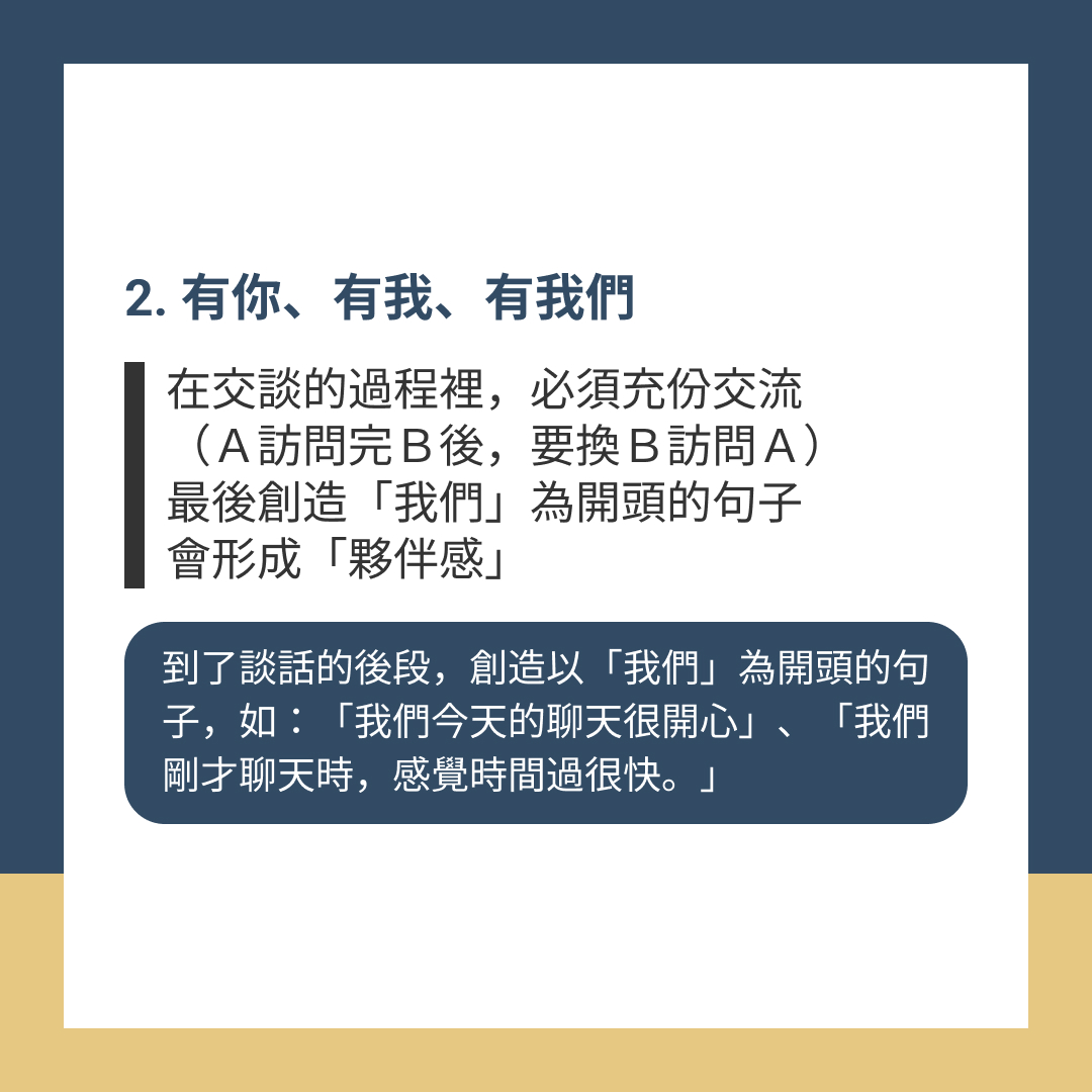 到了談話的後段,創造以「我們」為開頭的句子,如:「我們今天的聊天很開心」、「我們剛才聊天時,感覺時間過很快。」