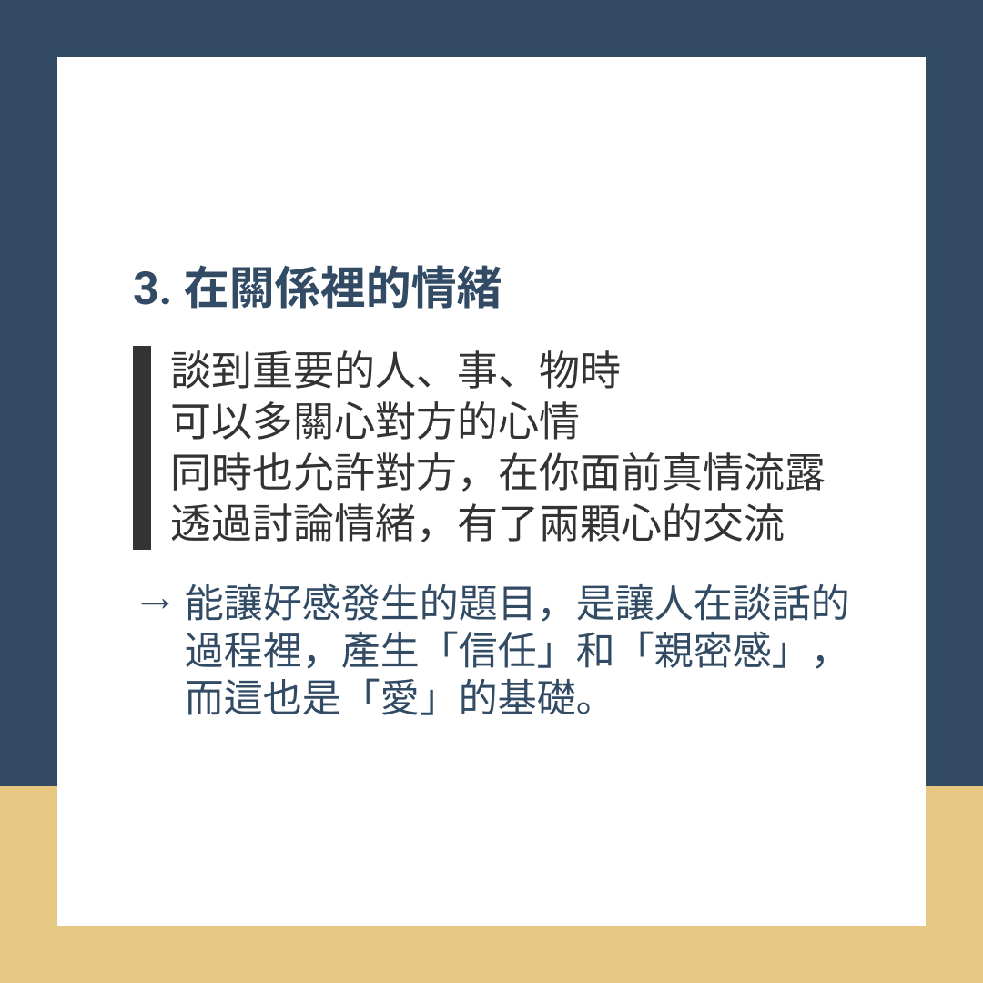 → 能讓好感發生的題目,是讓人在談話的過程裡,產生「信任」和「親密感」,而這也是「愛」的基礎。