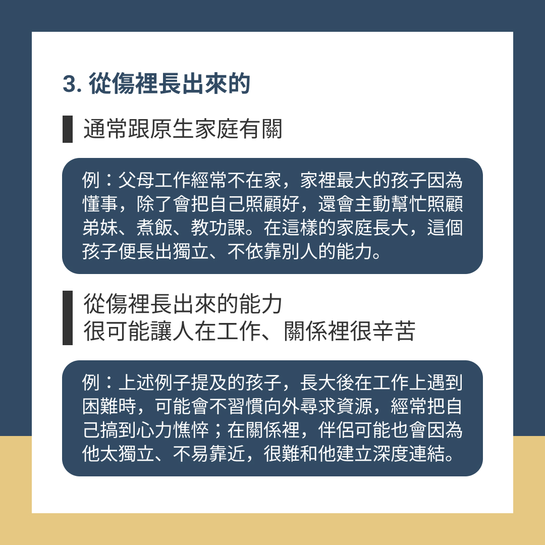例:父母工作經常不在家,家裡最大的孩子因為懂事,除了會把自己照顧好,不讓爸媽擔心,還會主動幫忙照顧弟弟妹妹、煮飯、教功課。在這樣的家庭長大,這個孩子便長出獨立、不依靠別人的能力。