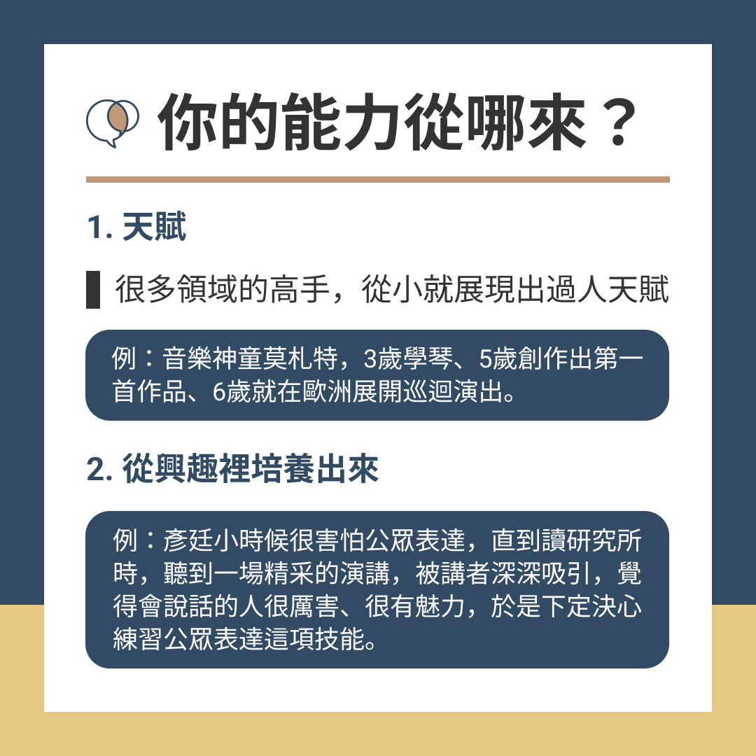 例:彥廷小時候很害怕公眾表達,人一多就容易結巴、語無倫次,直到讀研究所時,聽到一場精采的演講,被講者深深吸引,覺得會說話的人很厲害、很有魅力,於是下定決心練習公眾表達這項技能。
