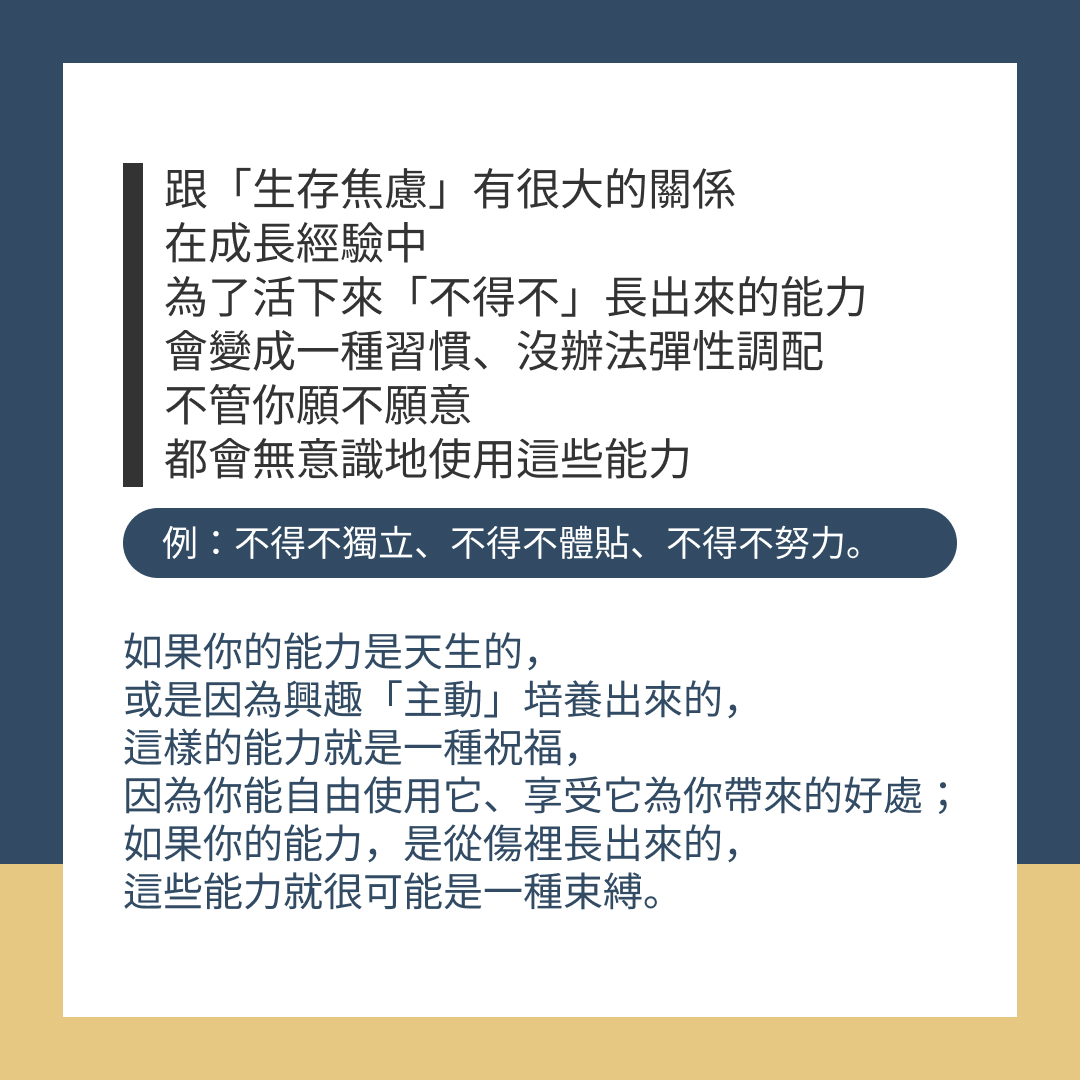 跟「生存焦慮」有很大的關係,在成長經驗中,為了活下來「不得不」長出的能力,會變成一種習慣、沒辦法彈性調配,不管你願不願意,都會無意識地使用這些能力