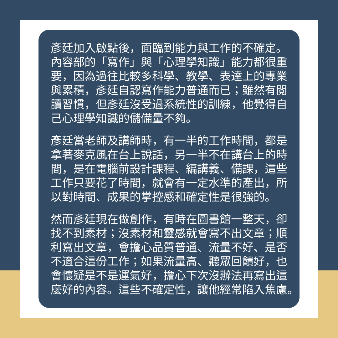 彥廷加入啟點後,面臨到能力與工作的不確定。身為內容部的一員,「寫作」與「心理學知識」都是很重要的能力,因為過往比較多科學、教學、表達上的專業與累積,彥廷自認寫作能力普通而已;雖然一直都有閱讀的習慣,但沒有受過系統性的訓練,讓彥廷覺得,自己心理學知識的儲備量不夠,寫某些題材的腳本時特別辛苦,需要花很多時間弄懂、摸透相關的理論。